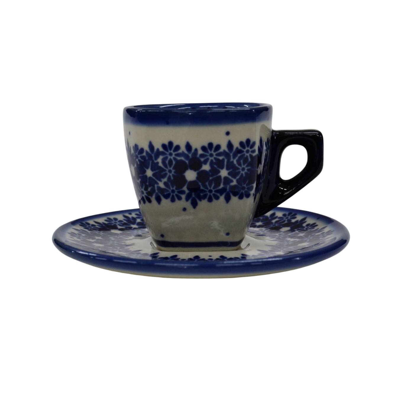 Piękna ceramiczna filiżanka kwadratowa ze spodkiem do kawy Espresso o pojemności 70 ml, wyprodukowana w bolesławieckim zakładzie ceramiki artystycznej. Ręcznie zdobione naczynie ceramiczne w piękne wzory kamionki bolesławieckiej. Mocna kawa Espresso może zostać podana w tej filiżance podczas codziennego picia kawy bądź przyjęć.