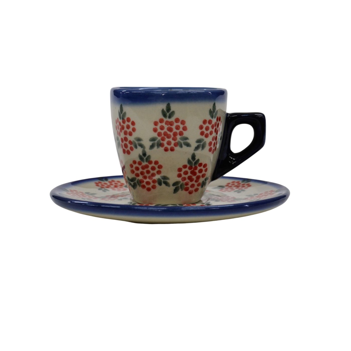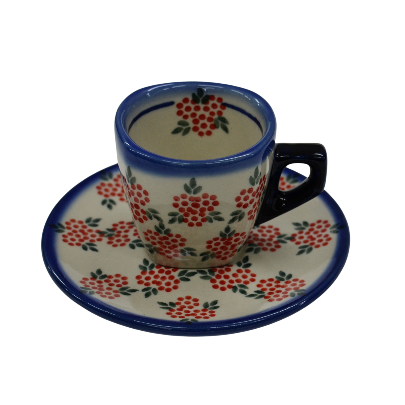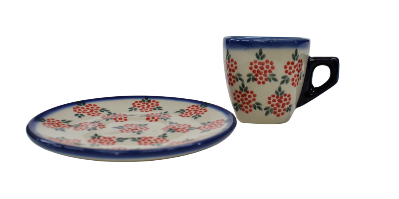 Piękna ceramiczna filiżanka kwadratowa ze spodkiem do kawy Espresso o pojemności 70 ml, wyprodukowana w bolesławieckim zakładzie ceramiki artystycznej. Ręcznie zdobione naczynie ceramiczne w piękne wzory kamionki bolesławieckiej. Mocna kawa Espresso może zostać podana w tej filiżance podczas codziennego picia kawy bądź przyjęć.