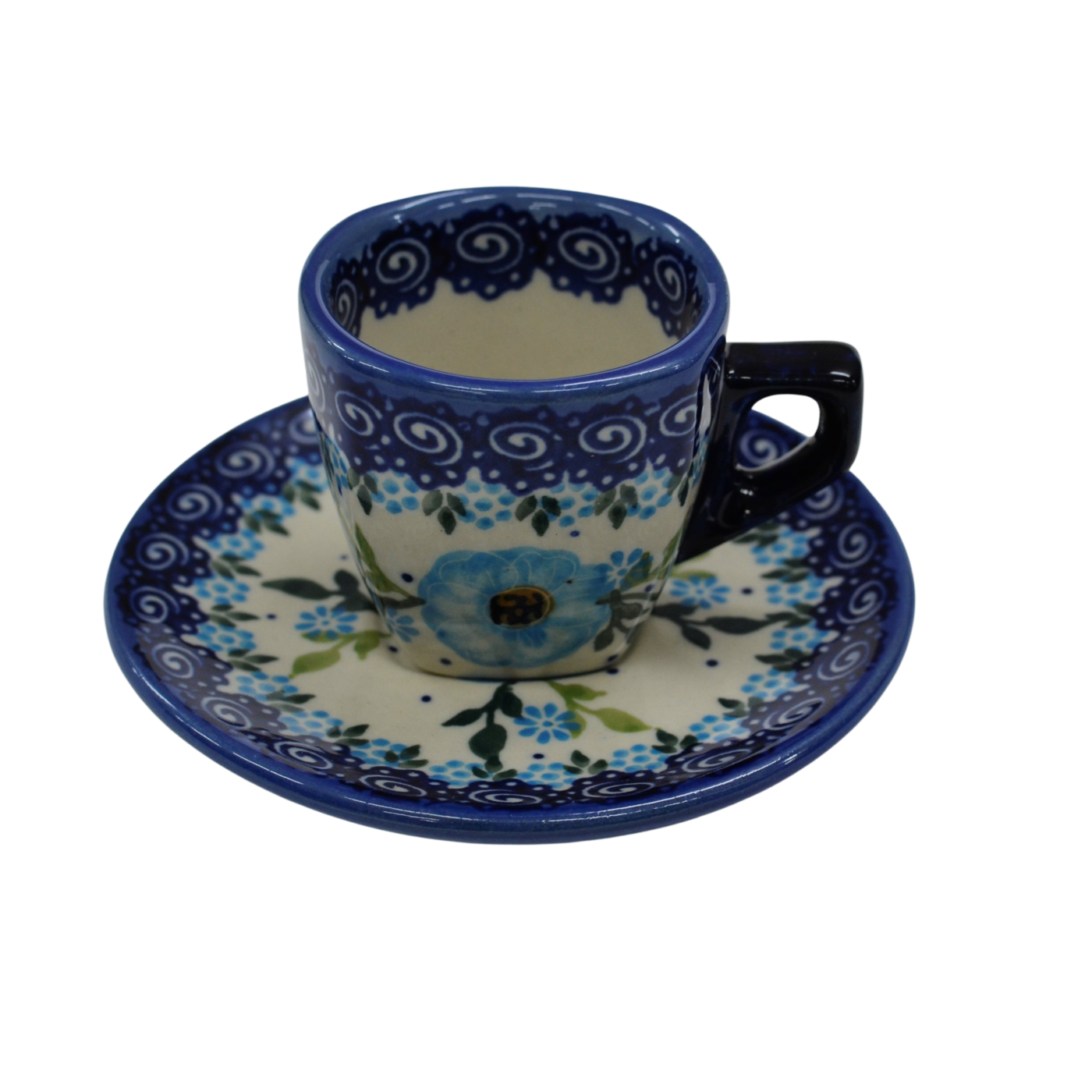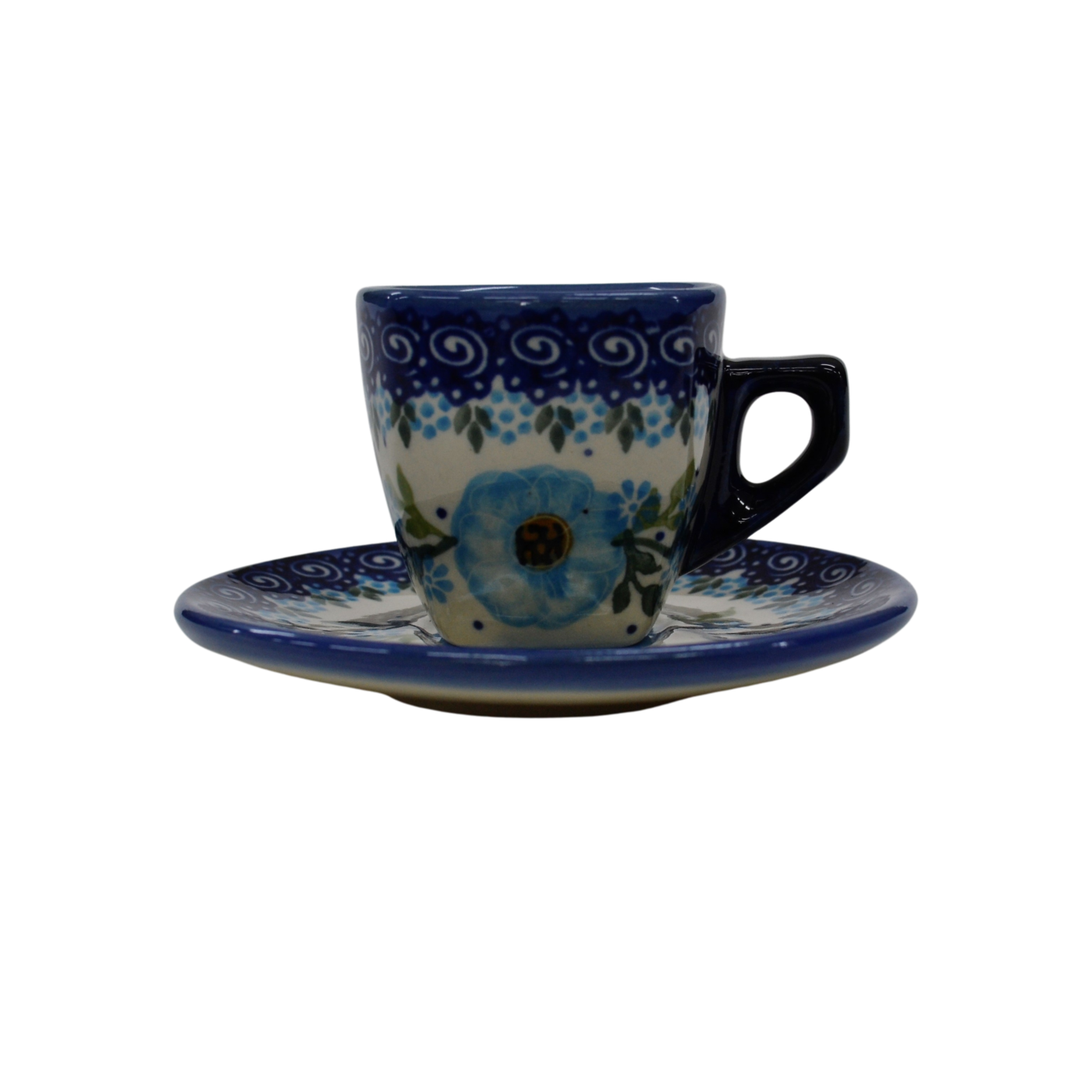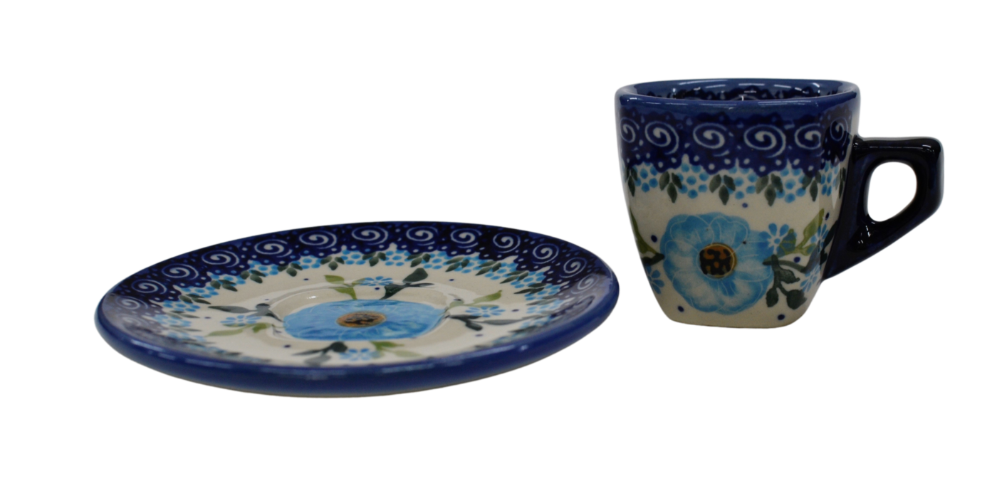 Piękna ceramiczna filiżanka kwadratowa ze spodkiem do kawy Espresso o pojemności 70 ml, wyprodukowana w bolesławieckim zakładzie ceramiki artystycznej. Ręcznie zdobione naczynie ceramiczne w piękne wzory kamionki bolesławieckiej. Mocna kawa Espresso może zostać podana w tej filiżance podczas codziennego picia kawy bądź przyjęć.