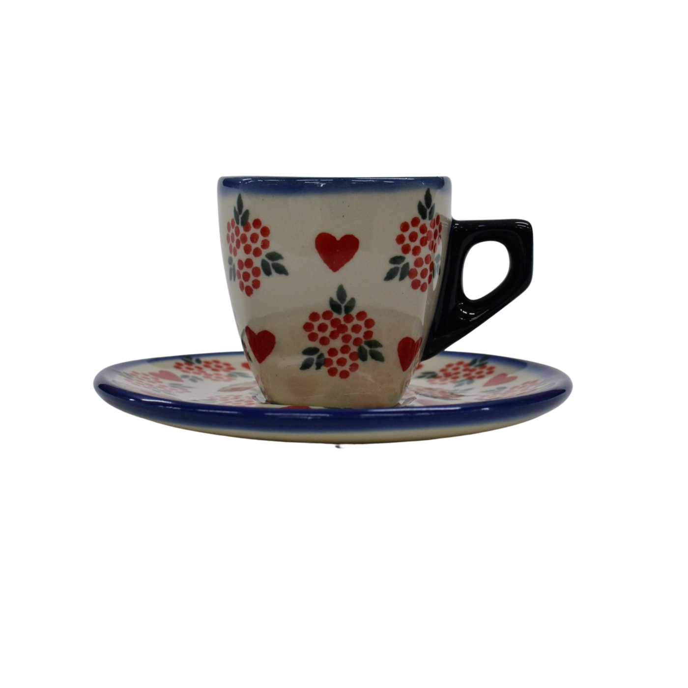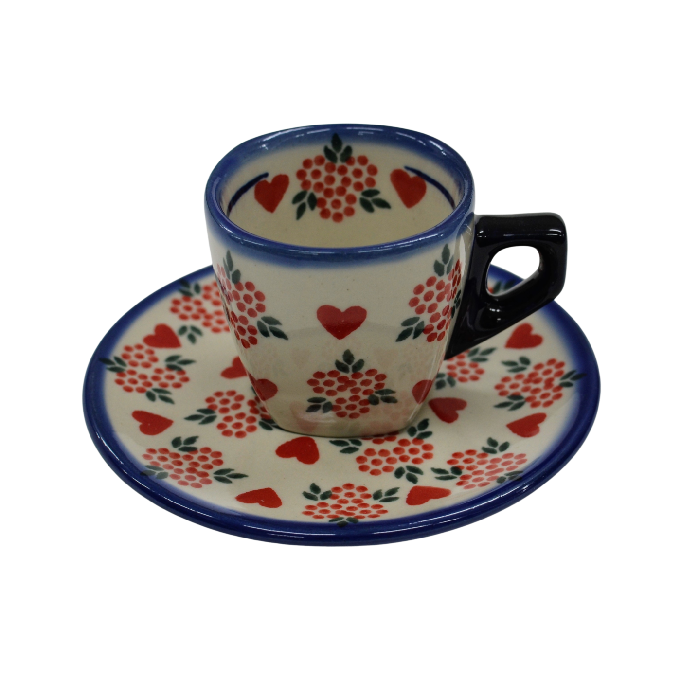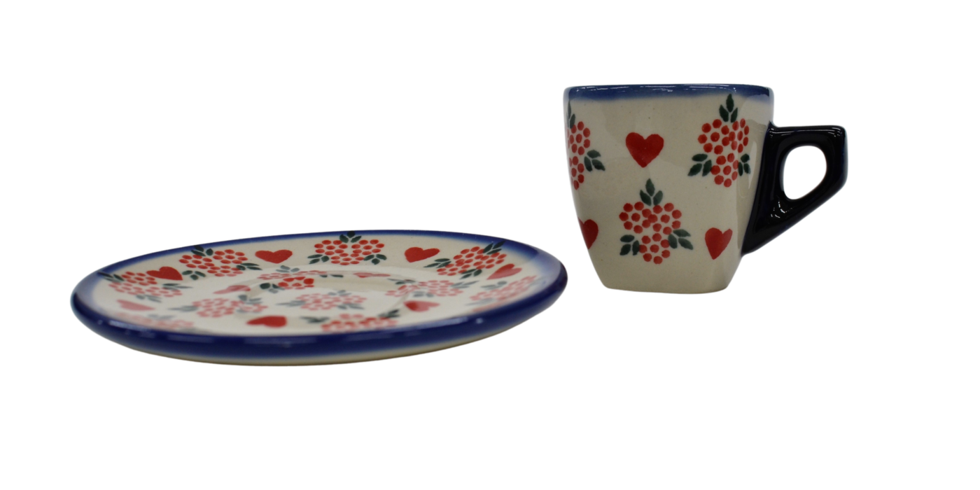 Piękna ceramiczna filiżanka kwadratowa ze spodkiem do kawy Espresso o pojemności 70 ml, wyprodukowana w bolesławieckim zakładzie ceramiki artystycznej. Ręcznie zdobione naczynie ceramiczne w piękne wzory kamionki bolesławieckiej. Mocna kawa Espresso może zostać podana w tej filiżance podczas codziennego picia kawy bądź przyjęć.