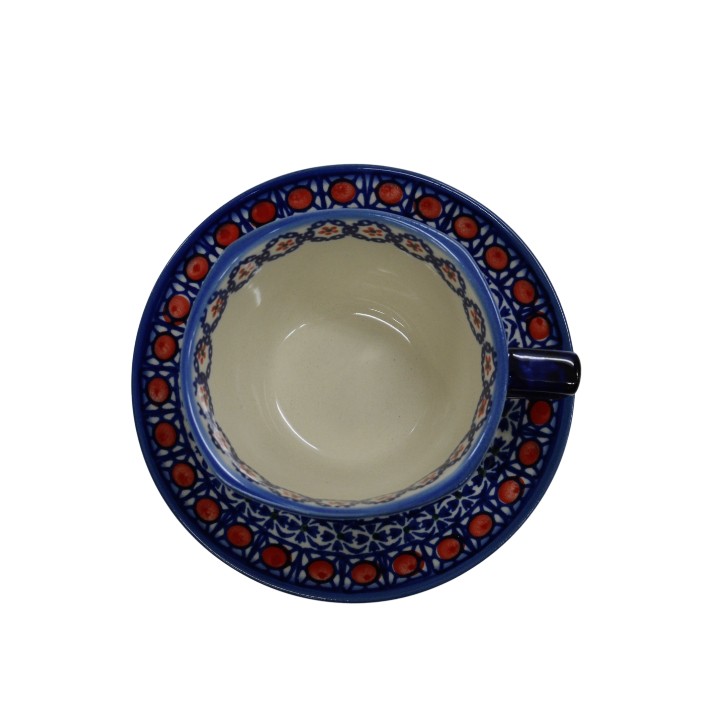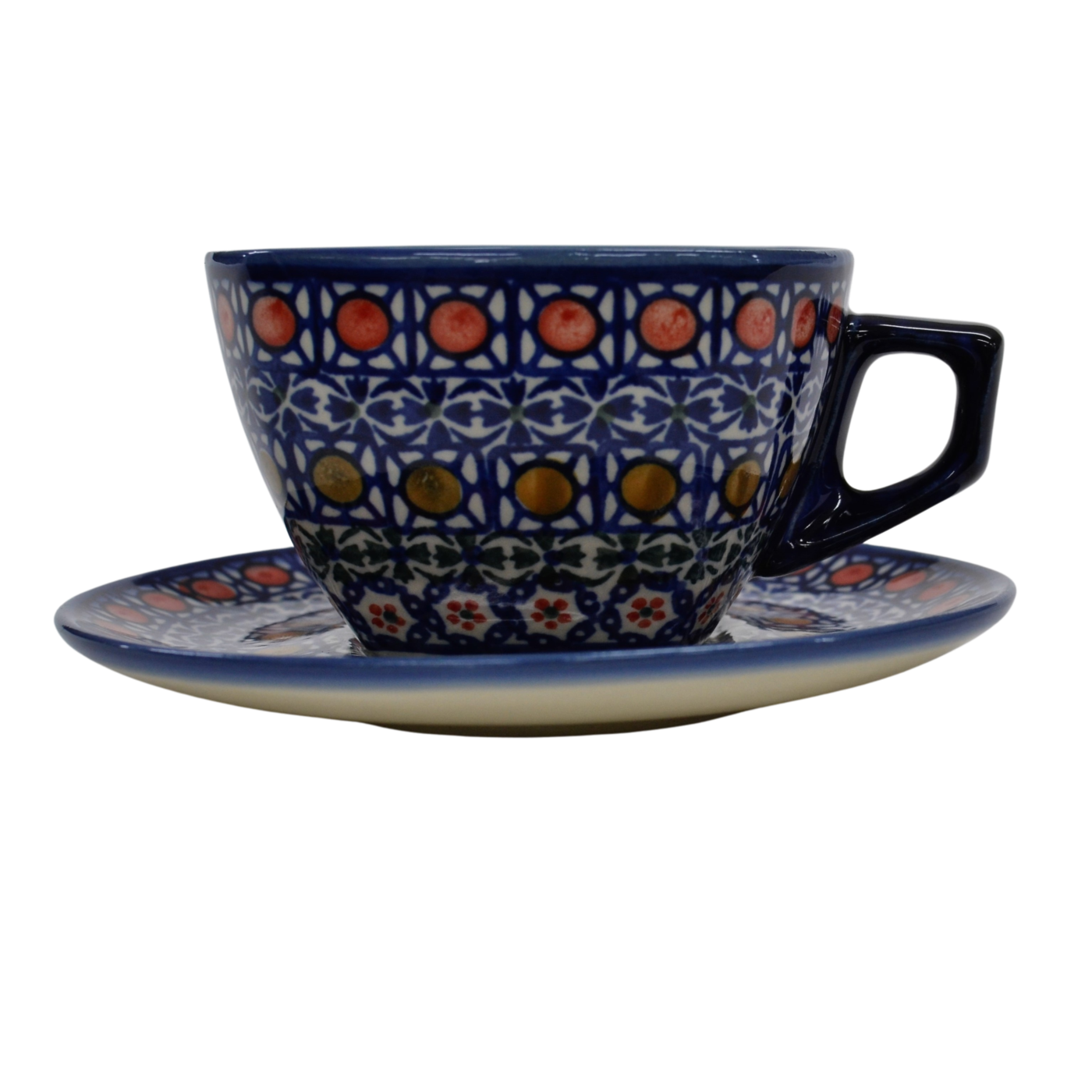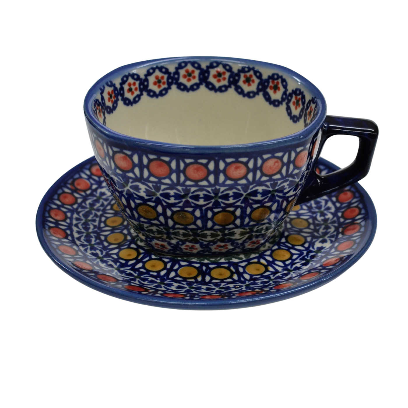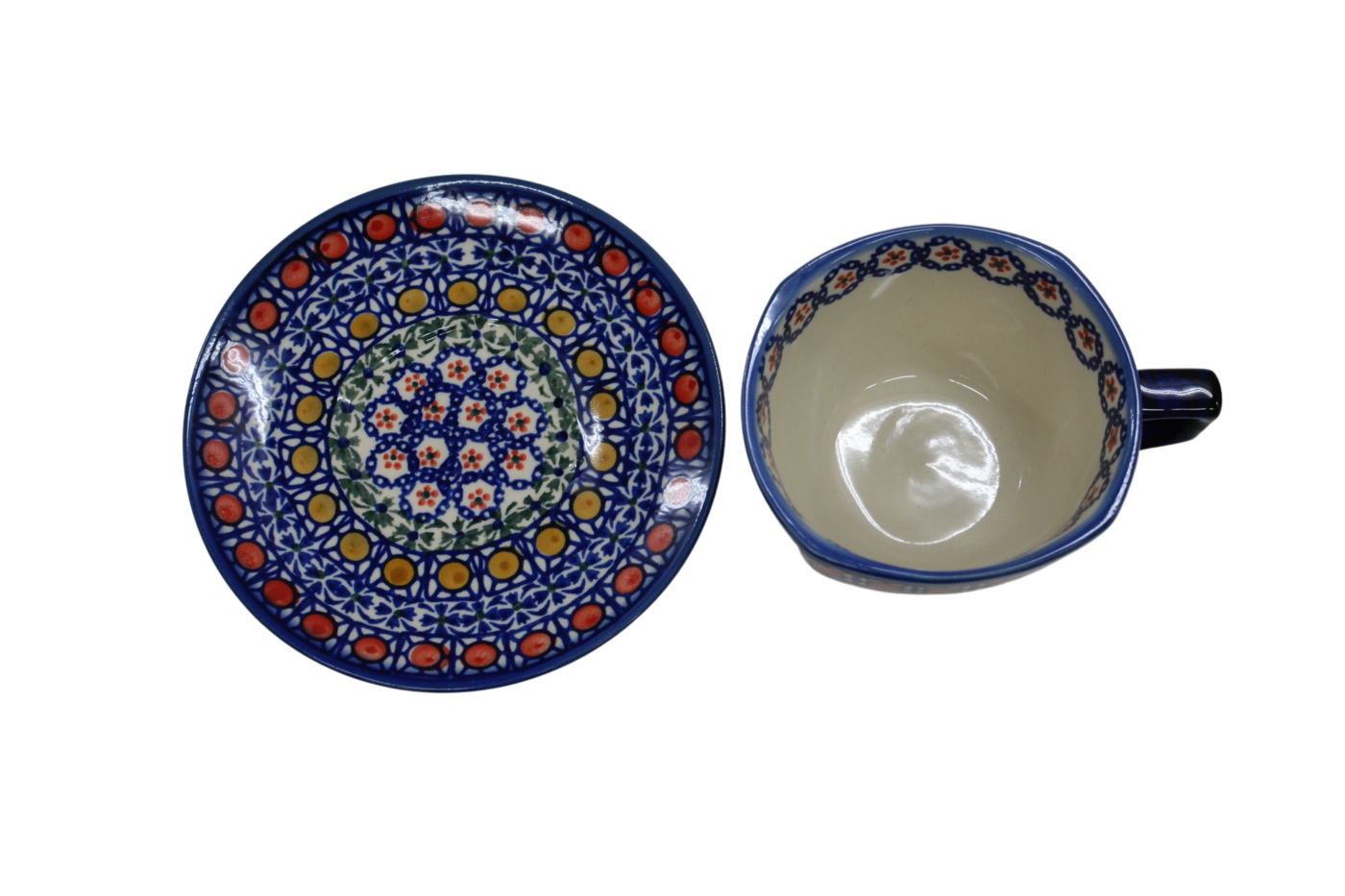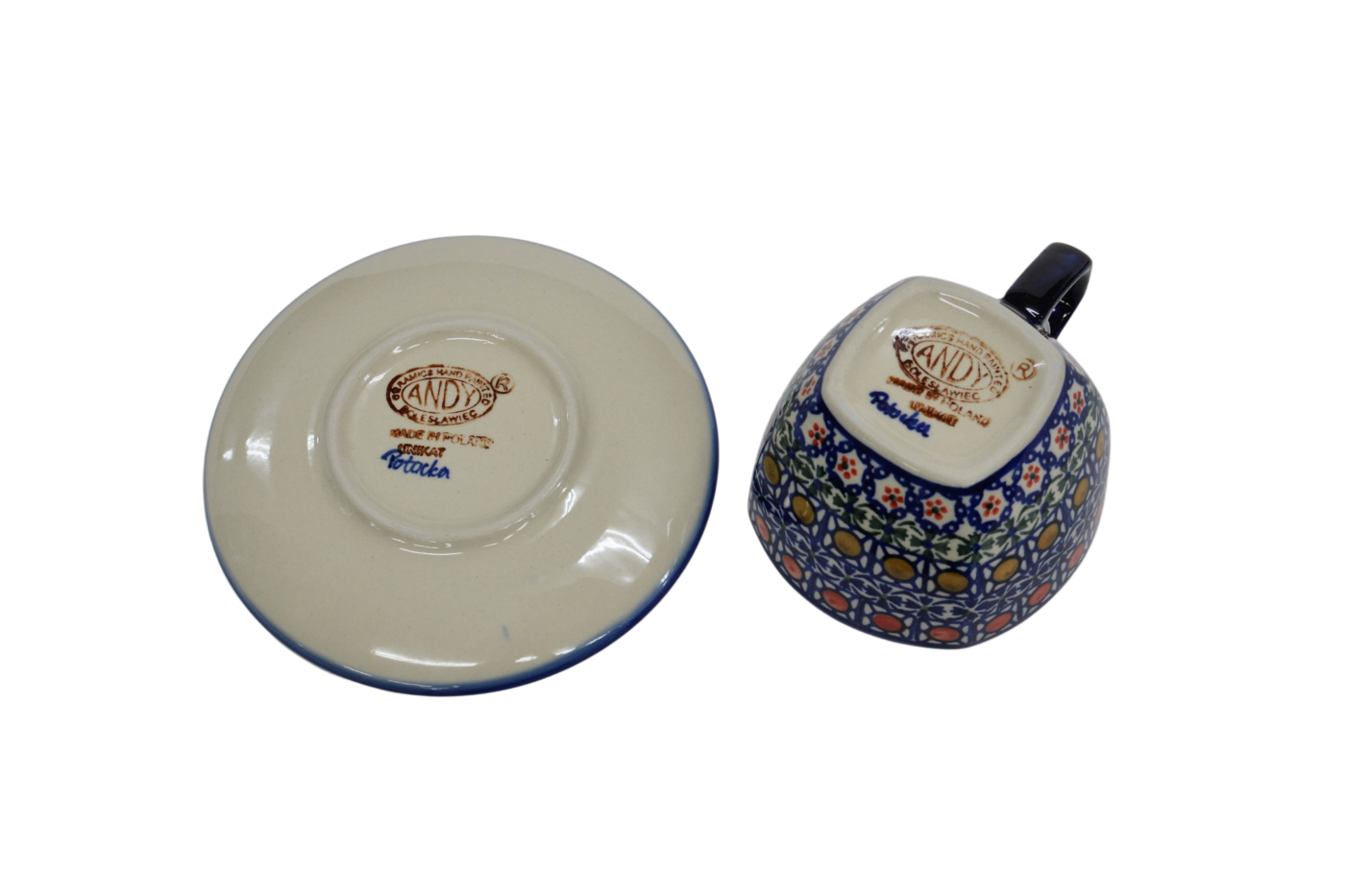 Oryginalna filiżanka bolesławiecka ze spodkiem (talerzykiem). Wyjątkowo piękna ceramiczna, podszkliwnie dekorowana, filiżanka kwadratowa ze spodkiem ceramicznym o pojemności aż 300ml.