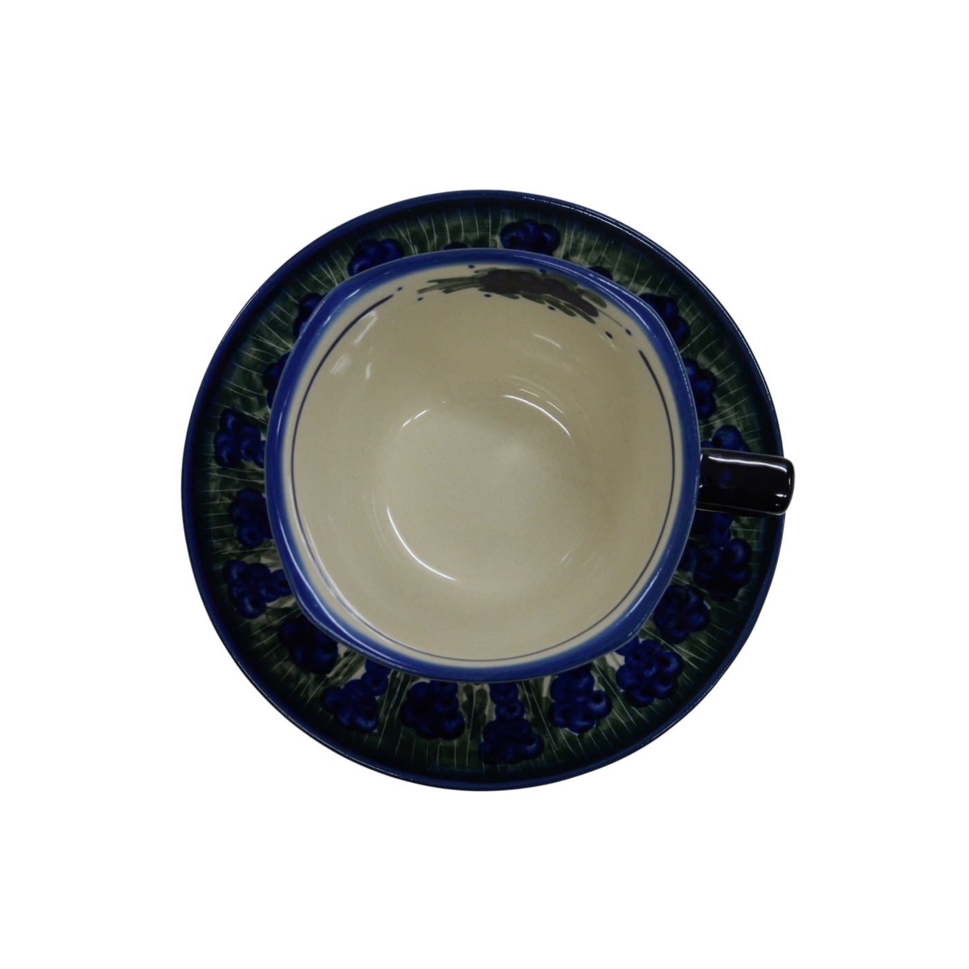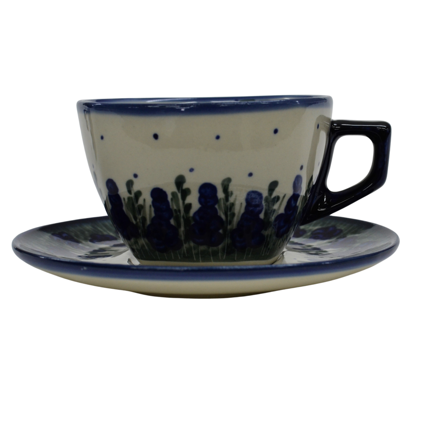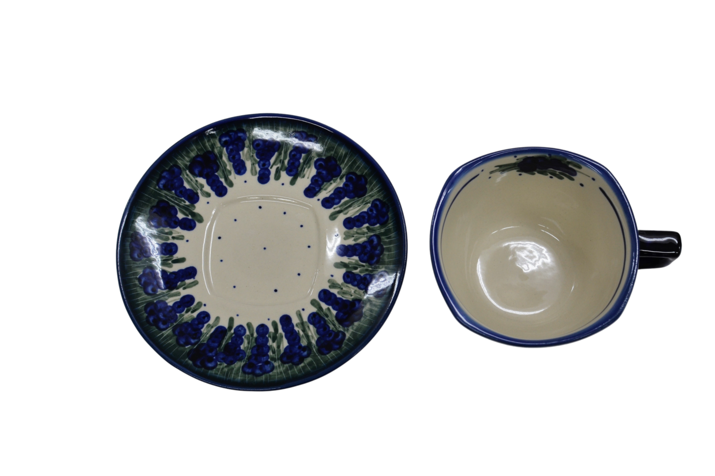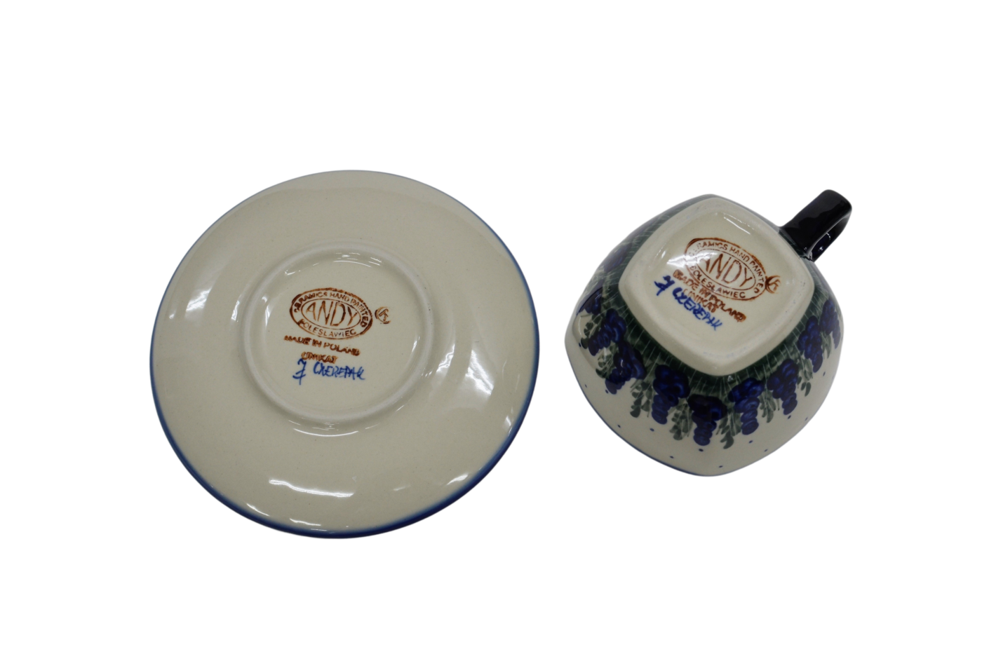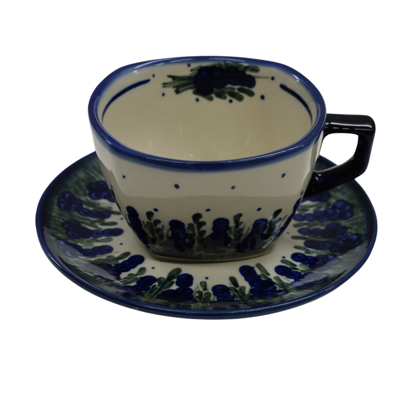 Oryginalna filiżanka bolesławiecka ze spodkiem (talerzykiem). Wyjątkowo piękna ceramiczna, podszkliwnie dekorowana, filiżanka kwadratowa ze spodkiem ceramicznym o pojemności aż 300ml.