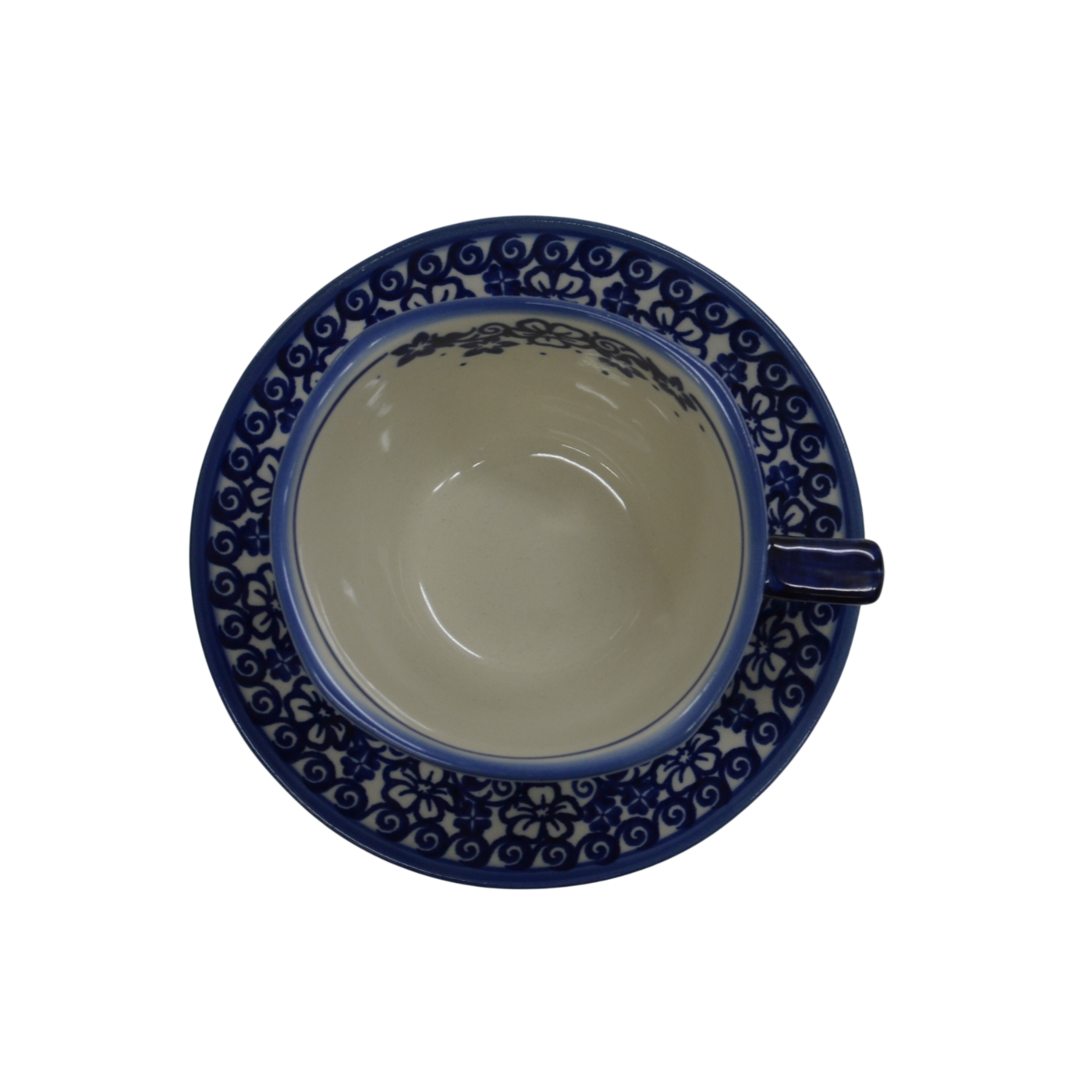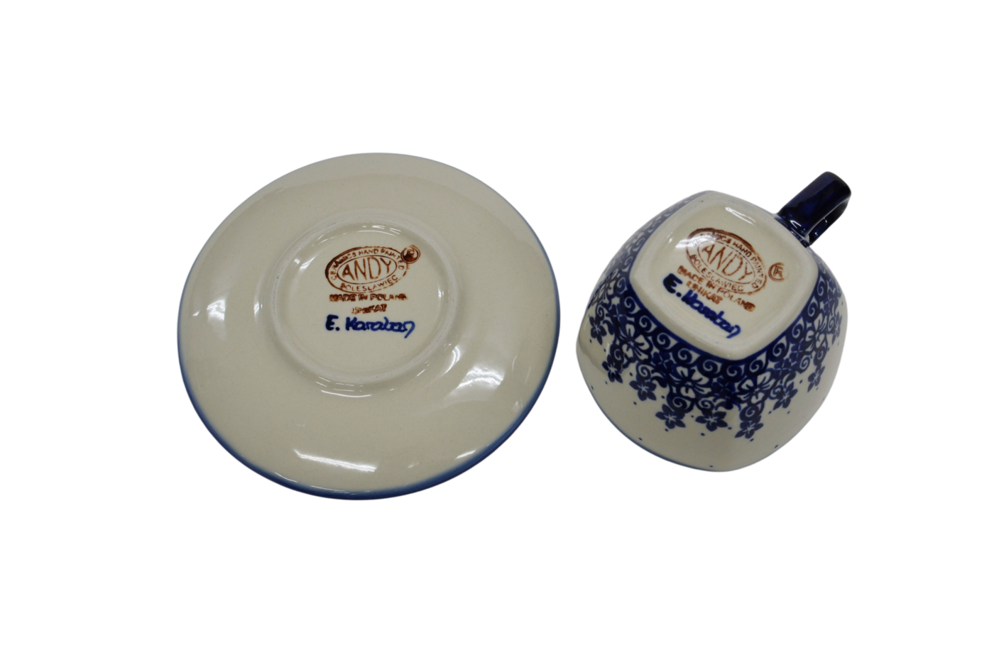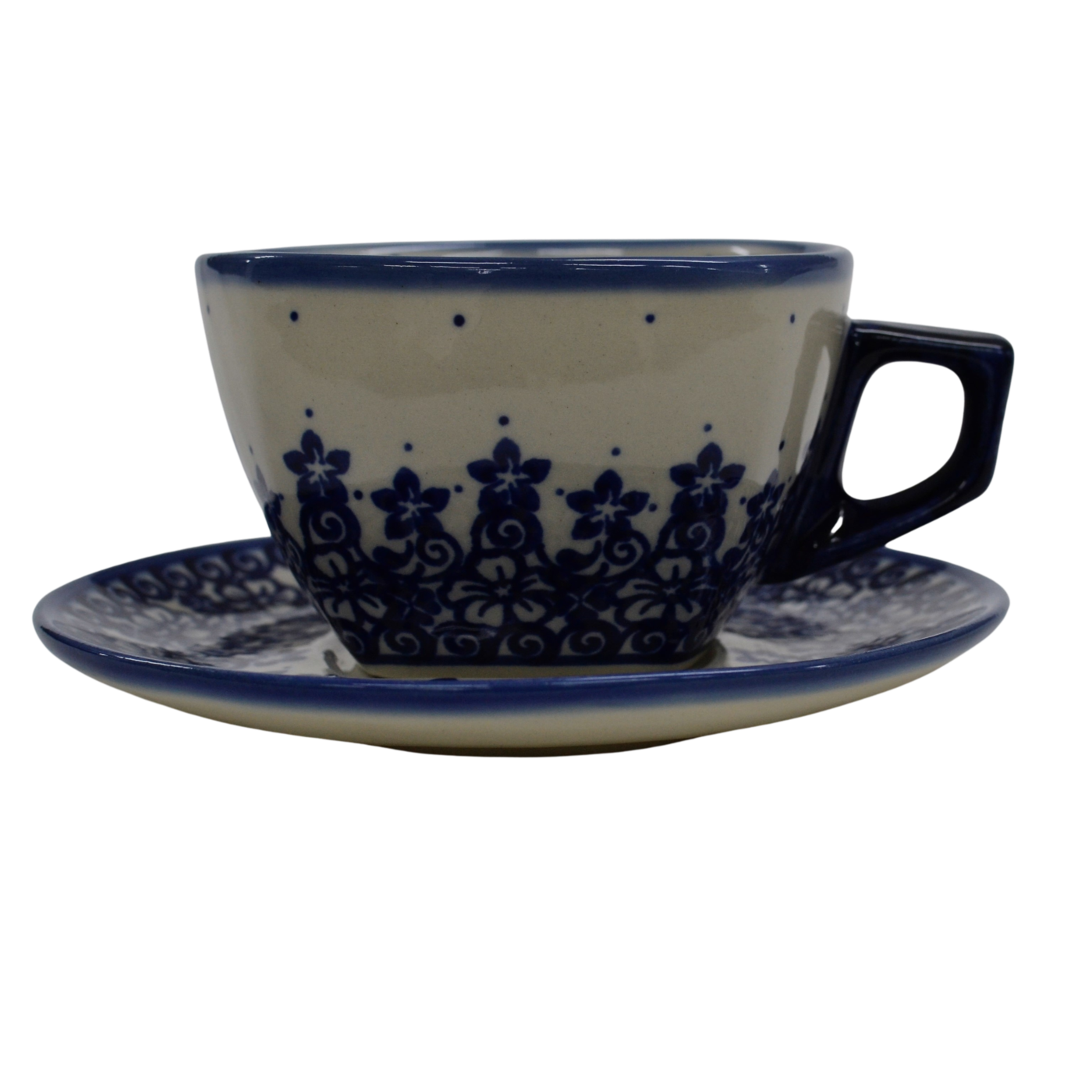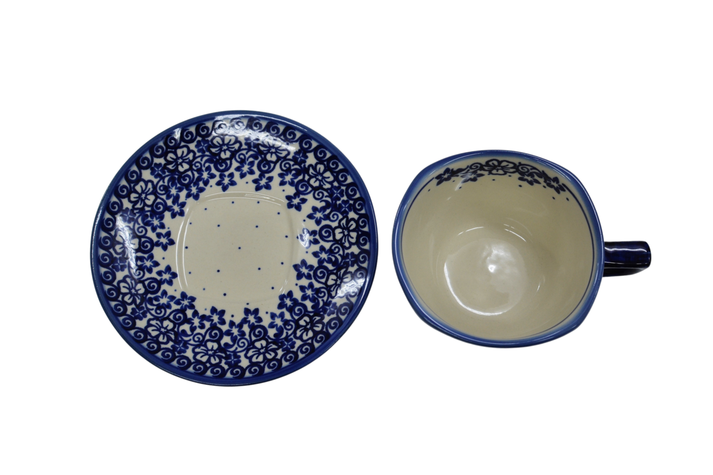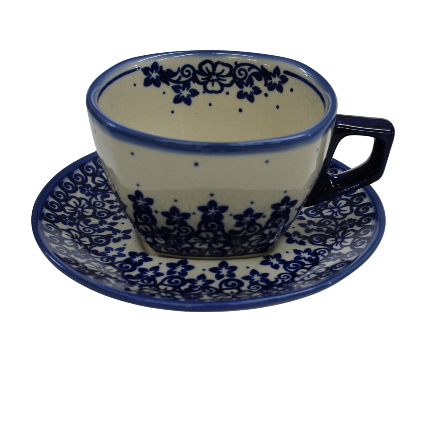 Oryginalna filiżanka bolesławiecka ze spodkiem (talerzykiem). Wyjątkowo piękna ceramiczna, podszkliwnie dekorowana, filiżanka kwadratowa ze spodkiem ceramicznym o pojemności aż 300ml.