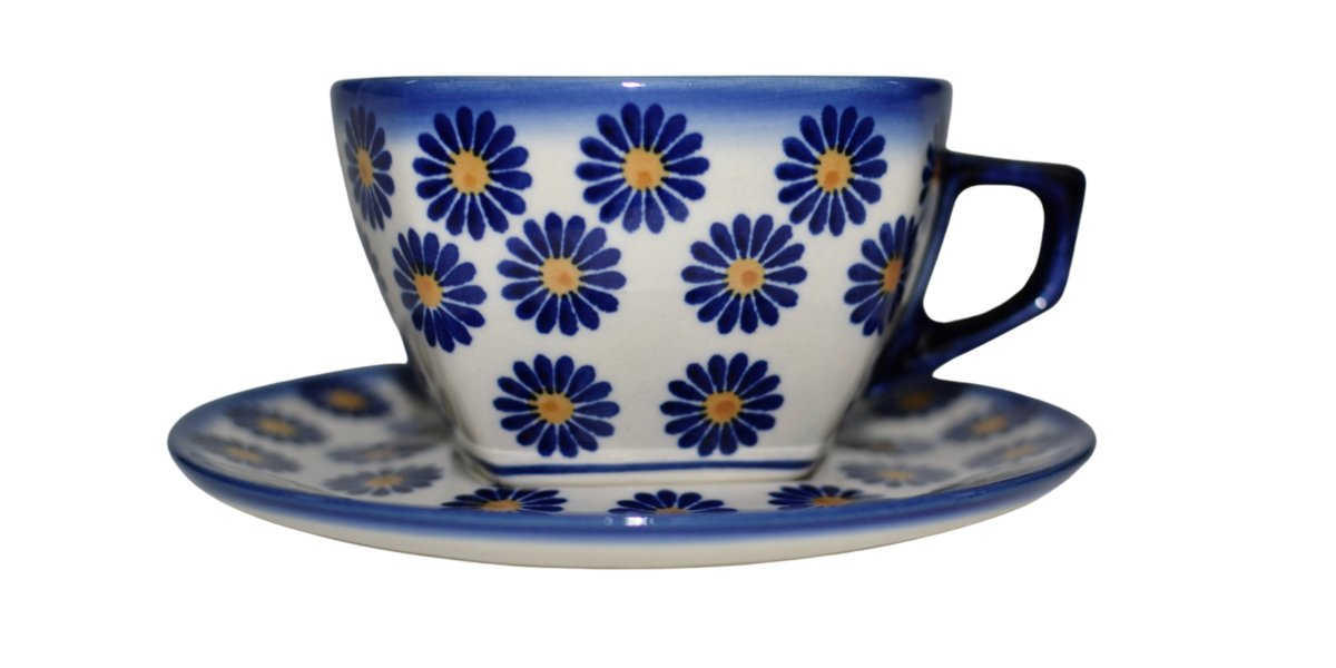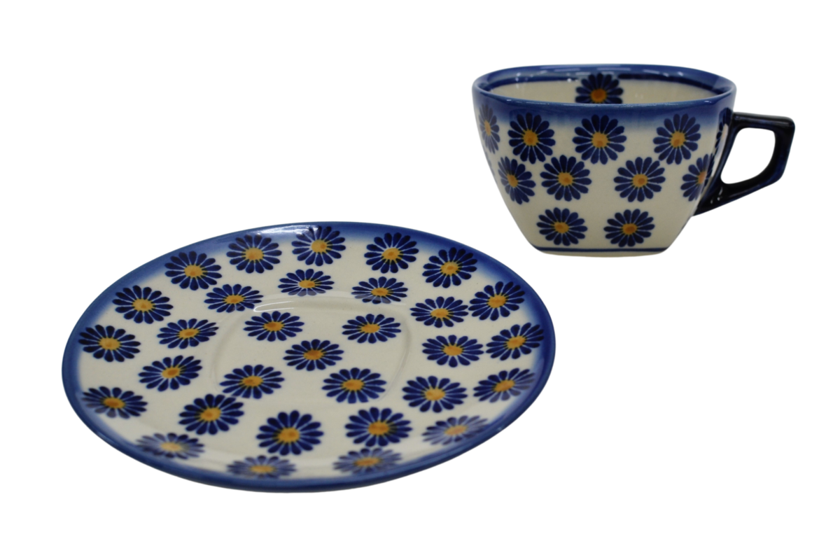 Oryginalna filiżanka bolesławiecka ze spodkiem (talerzykiem). Wyjątkowo piękna ceramiczna, podszkliwnie dekorowana, filiżanka kwadratowa ze spodkiem ceramicznym o pojemności aż 300ml.