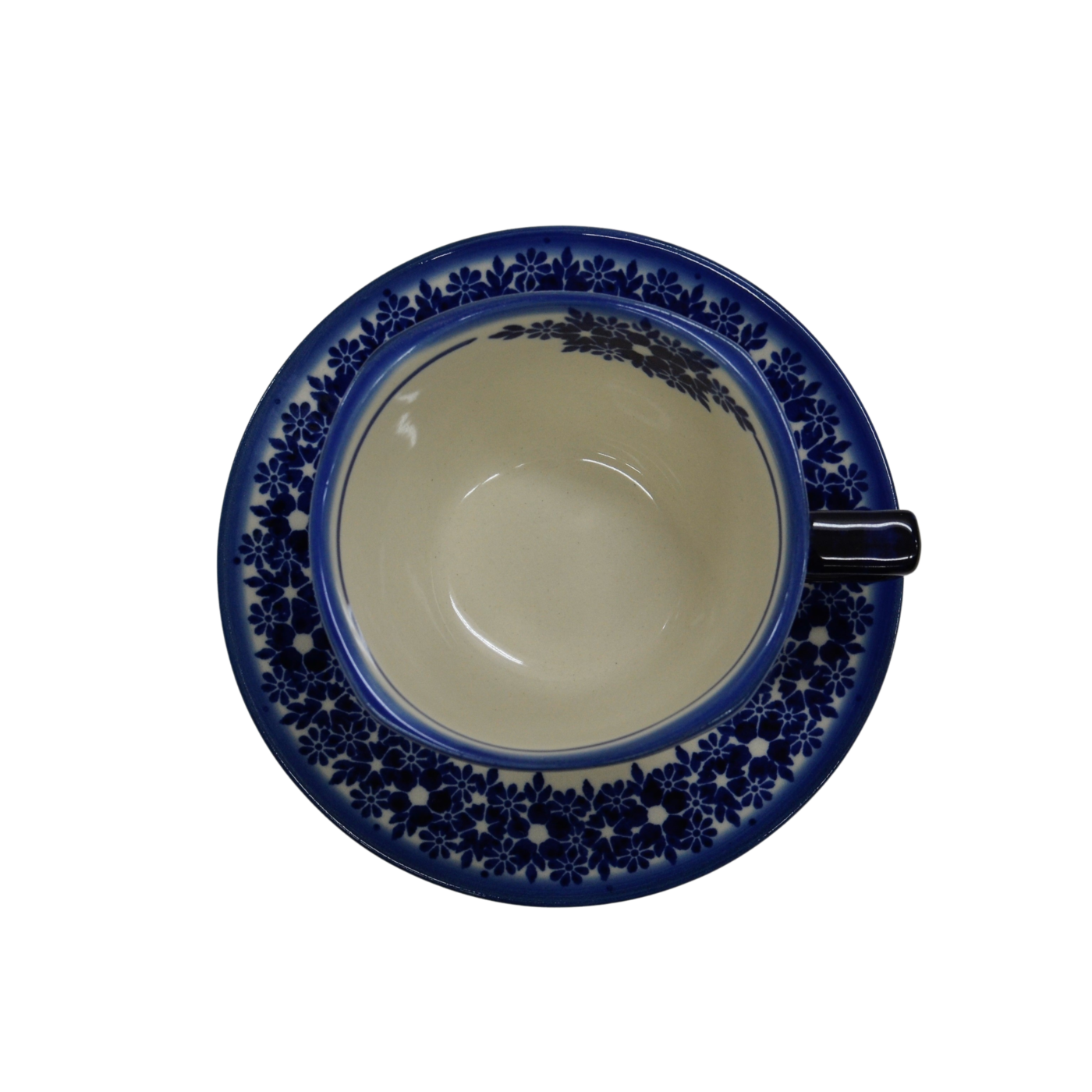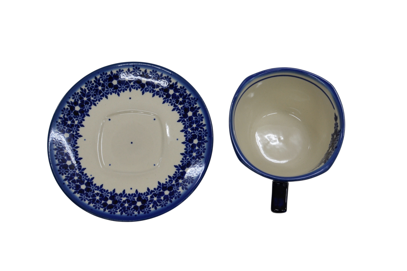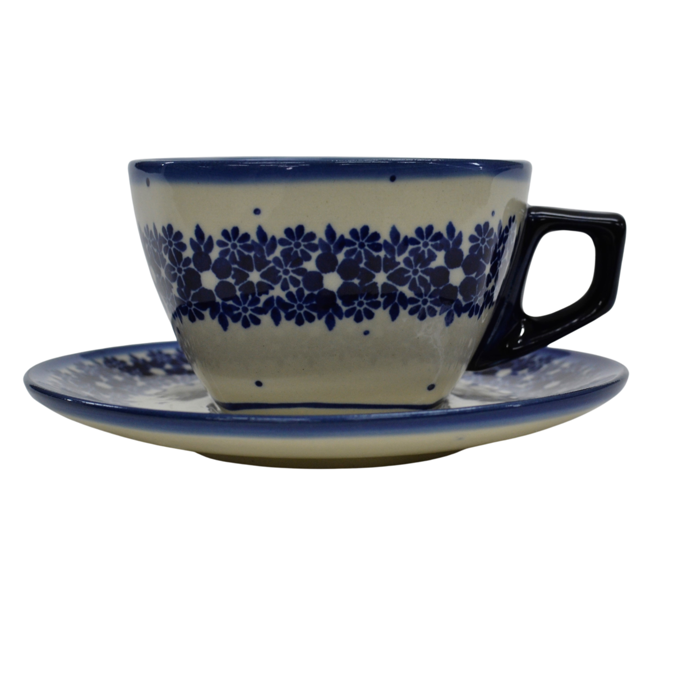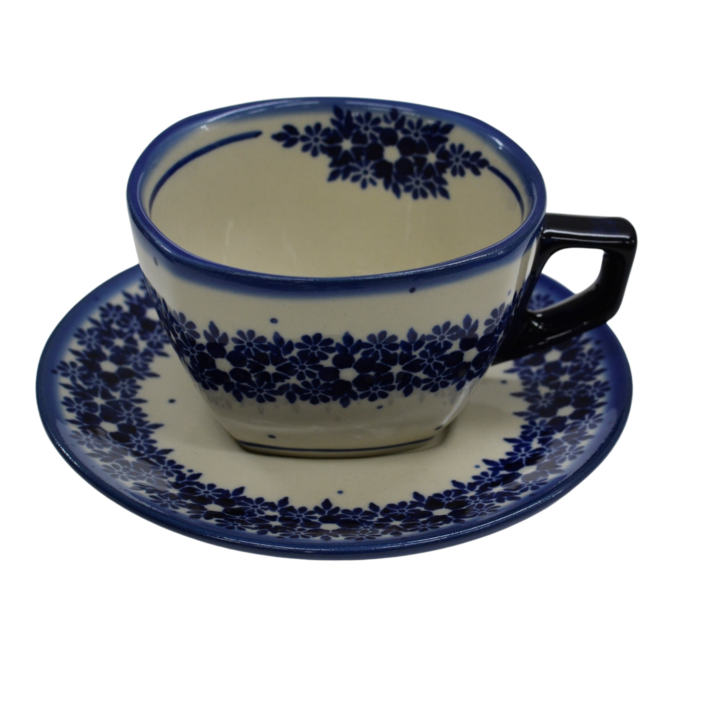 Oryginalna filiżanka bolesławiecka ze spodkiem (talerzykiem). Wyjątkowo piękna ceramiczna, podszkliwnie dekorowana, filiżanka kwadratowa ze spodkiem ceramicznym o pojemności aż 300ml.