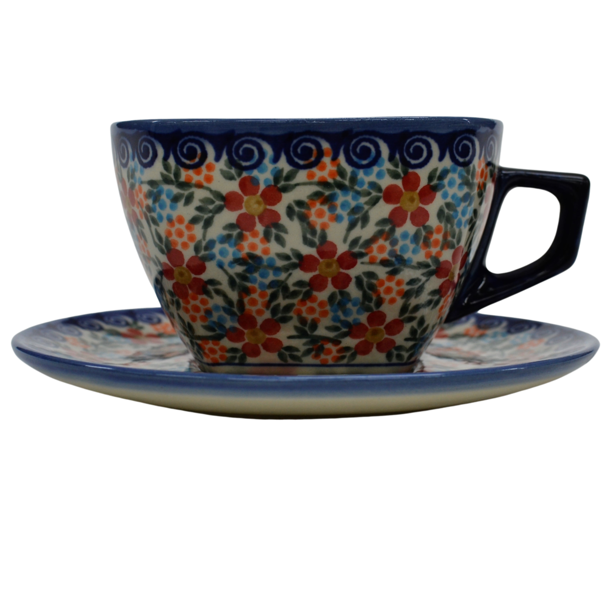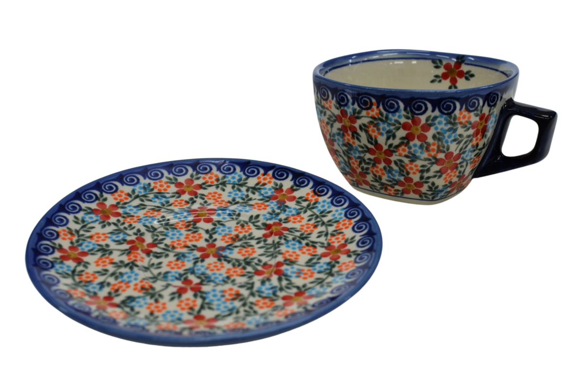 Oryginalna filiżanka bolesławiecka ze spodkiem (talerzykiem). Wyjątkowo piękna ceramiczna, podszkliwnie dekorowana, filiżanka kwadratowa ze spodkiem ceramicznym o pojemności aż 300ml.