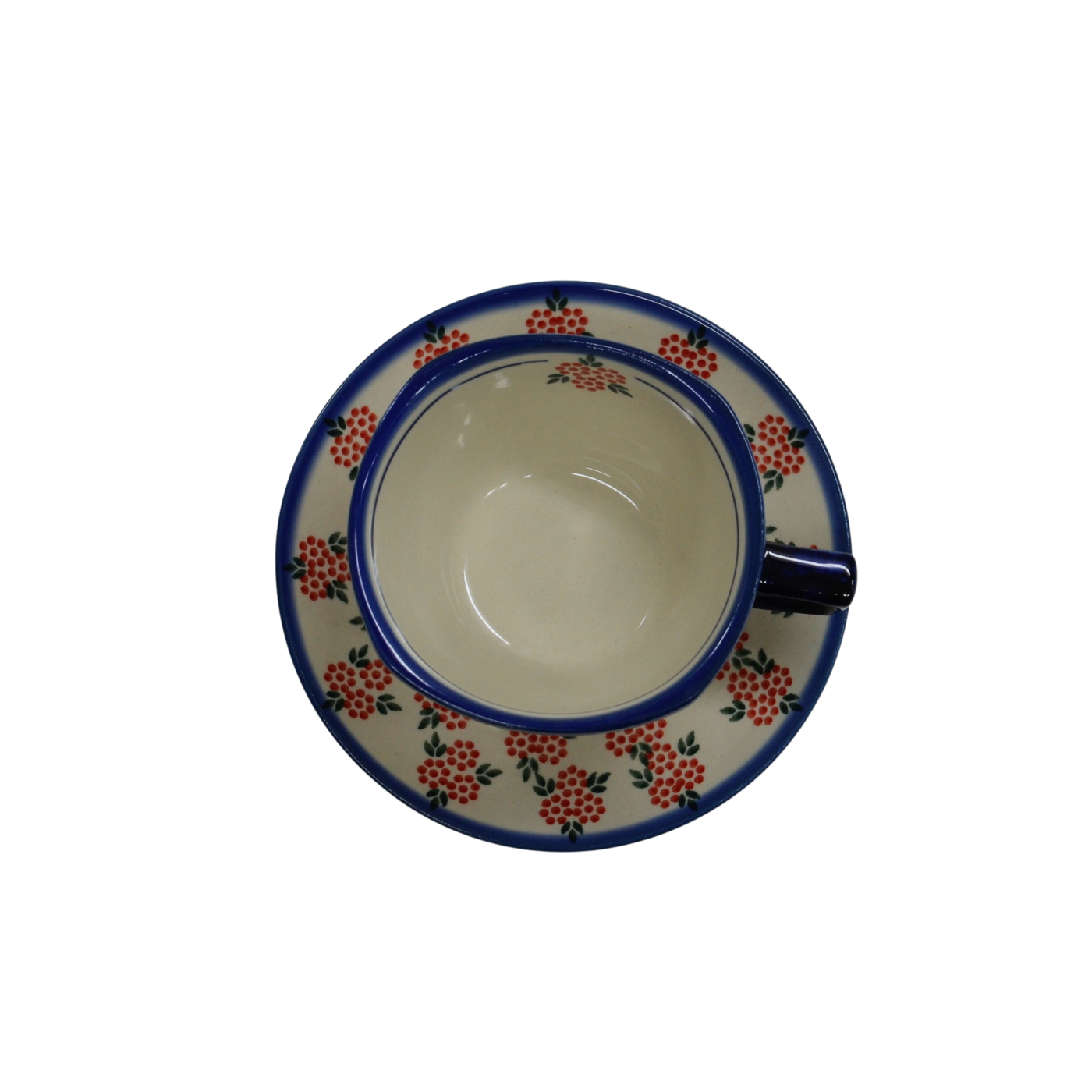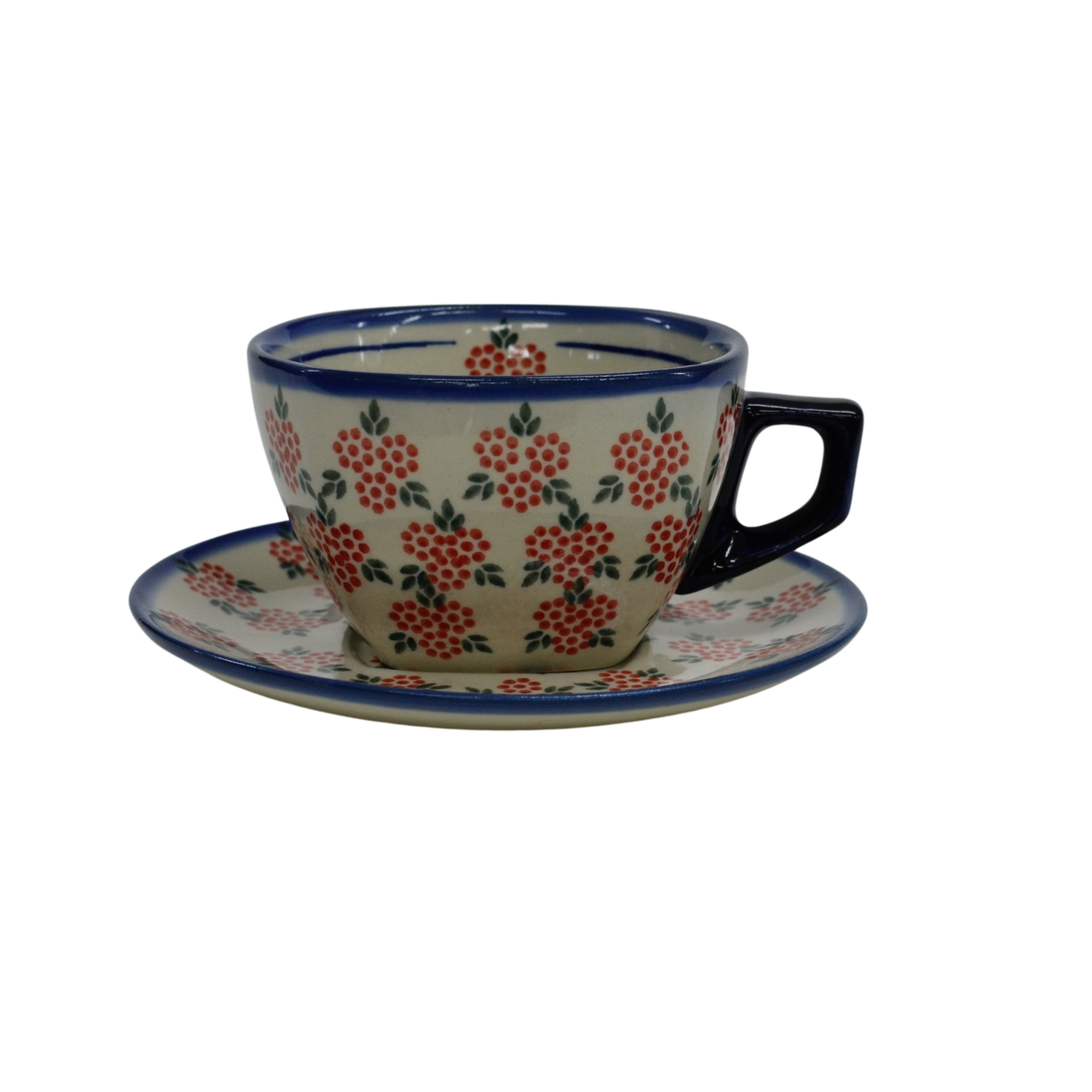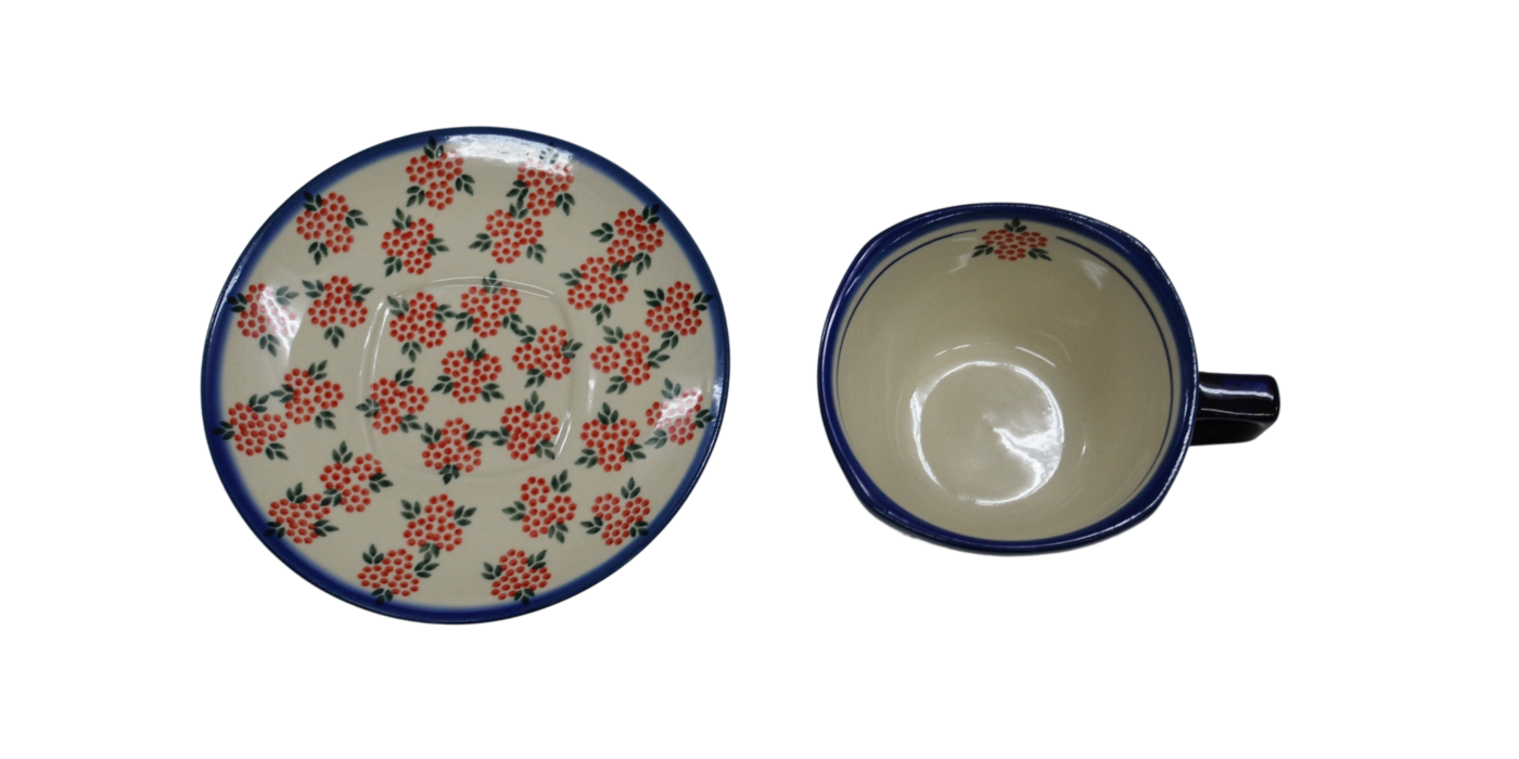 Oryginalna filiżanka bolesławiecka ze spodkiem (talerzykiem). Wyjątkowo piękna ceramiczna, podszkliwnie dekorowana, filiżanka kwadratowa ze spodkiem ceramicznym o pojemności aż 300ml.