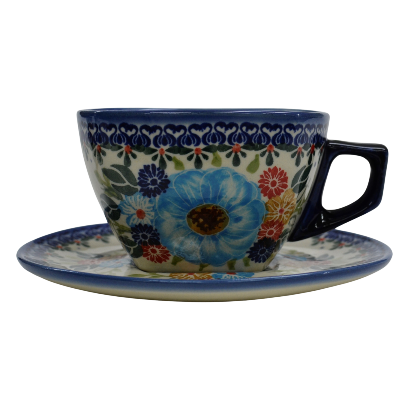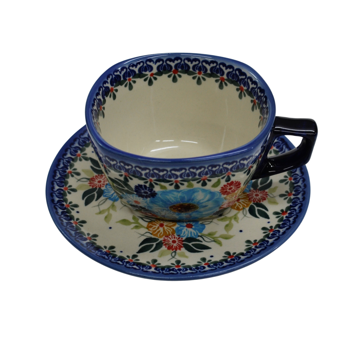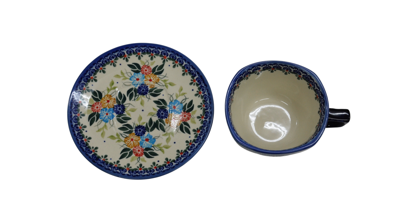 Oryginalna filiżanka bolesławiecka ze spodkiem (talerzykiem). Wyjątkowo piękna ceramiczna, podszkliwnie dekorowana, filiżanka kwadratowa ze spodkiem ceramicznym o pojemności aż 300ml.