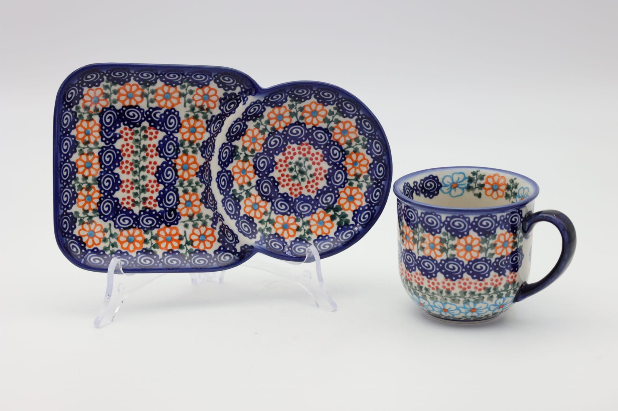 Wyjątkowo piękna, ręcznie zdobiona w Bolesławcu, ceramiczna filiżanka o pojemności 0,25 l w zestawie z tacką ceramiczną (spodkiem).