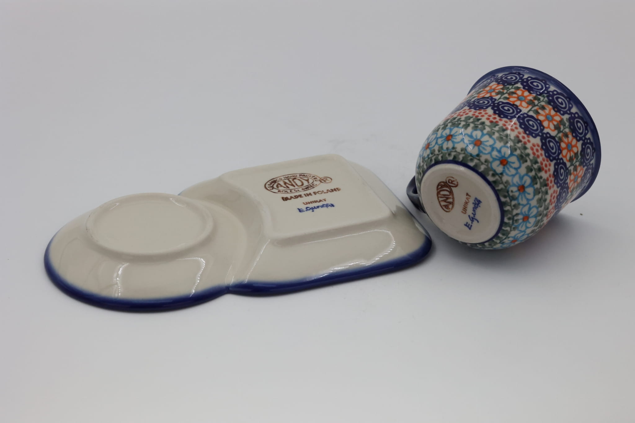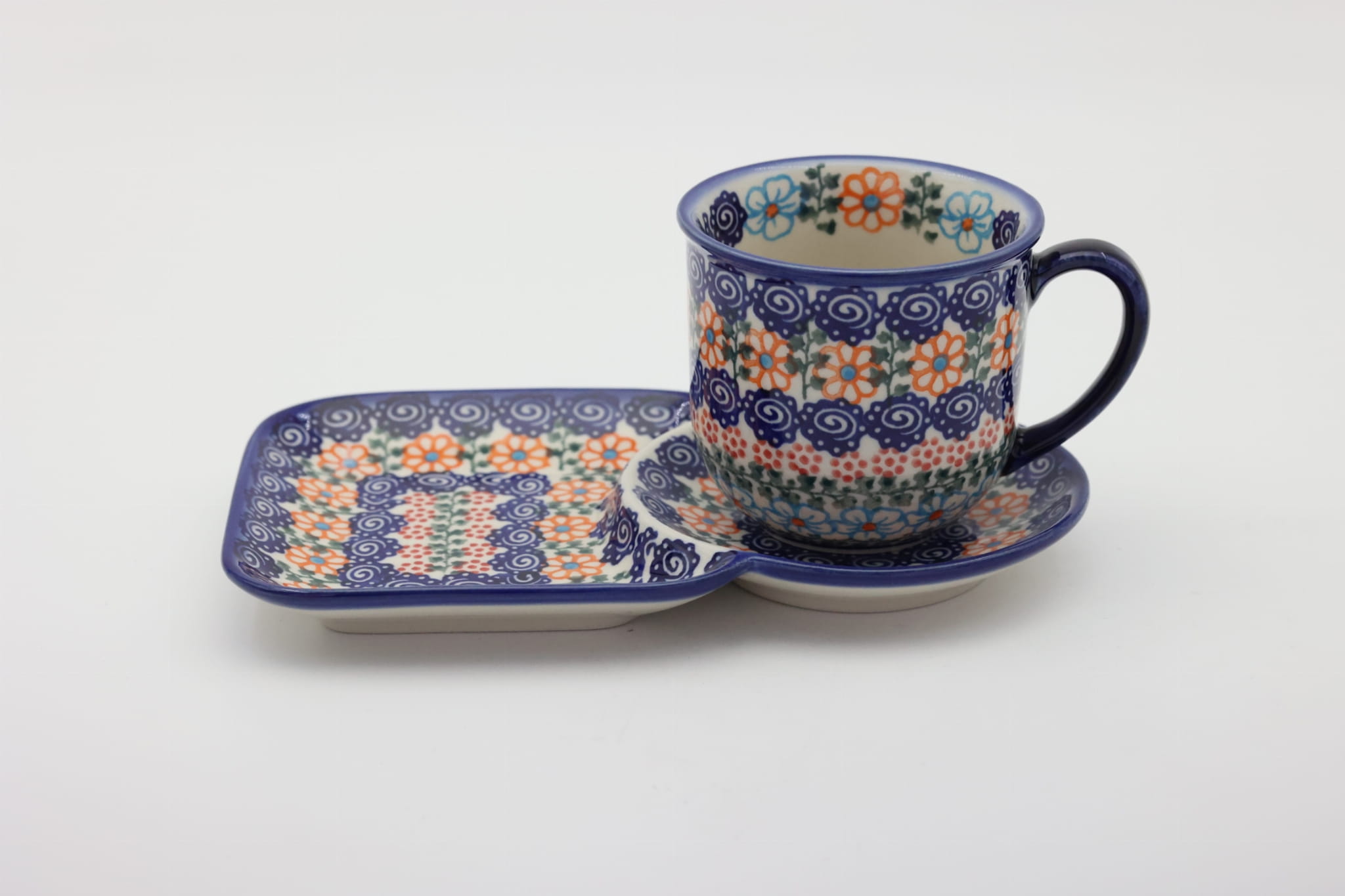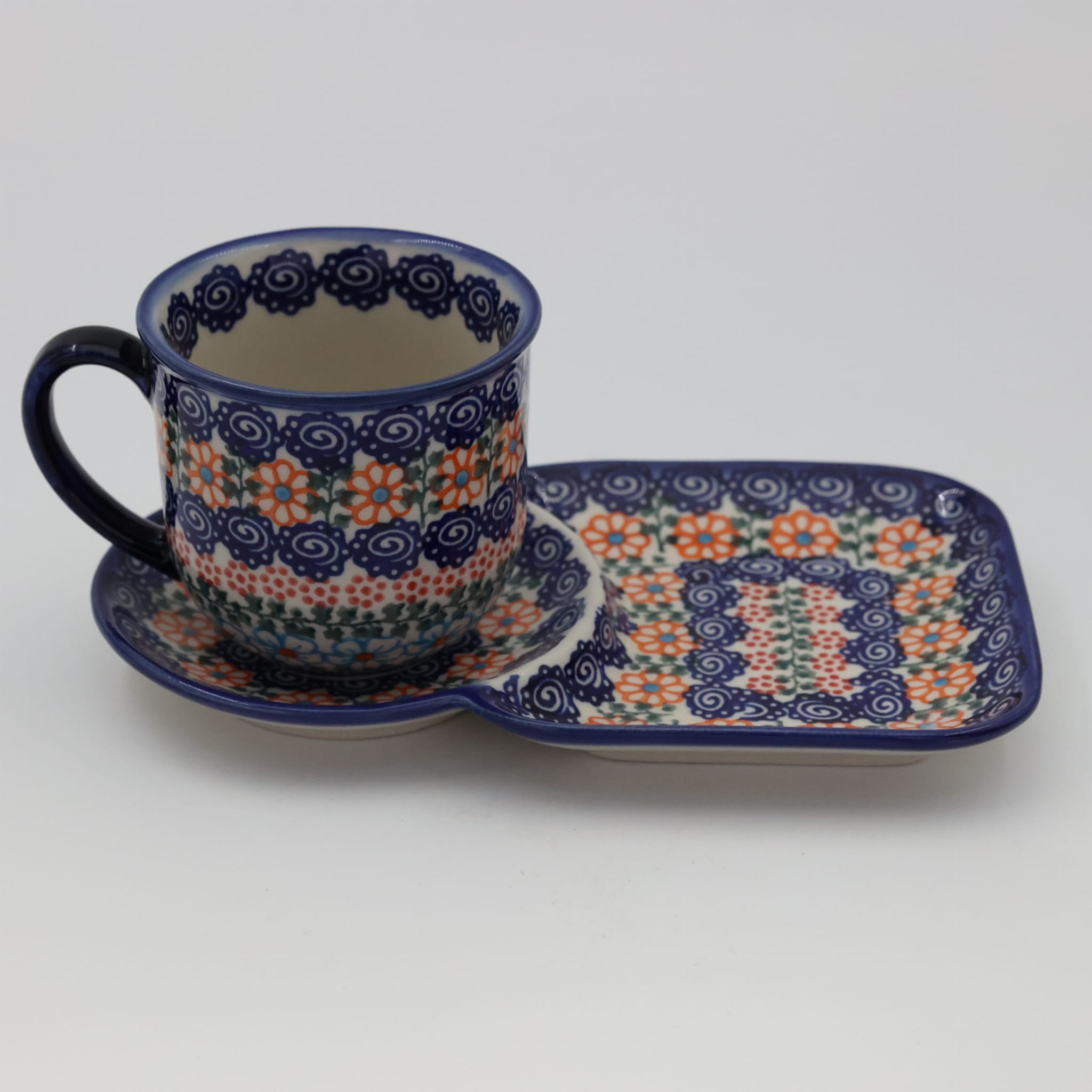 Filiżanka z tacką, tworzą oryginalne połączenie naczyń z bolesławieckiego zakładu ceramiki kamionkowej. Zestaw nadaje się do podawania kawy i herbaty wraz z kanapką pod czas śniadania bądź do podania ulubionego napoju ze słodkim ciastkiem prostu z cukierni bądź domowym wypiekiem.
