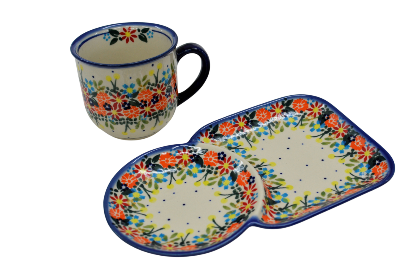 Wyjątkowo piękna, ręcznie zdobiona w Bolesławcu, ceramiczna filiżanka o pojemności 0,25 l w zestawie z tacką ceramiczną (spodkiem).