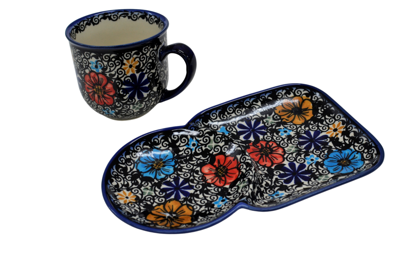 Wyjątkowo piękna, ręcznie zdobiona w Bolesławcu, ceramiczna filiżanka o pojemności 0,25 l w zestawie z tacką ceramiczną (spodkiem).