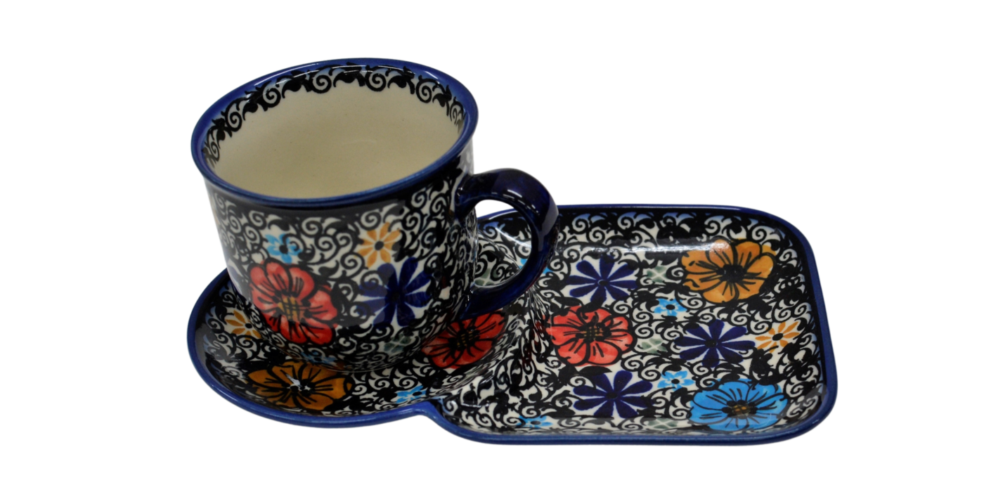 Filiżanka z tacką, tworzą oryginalne połączenie naczyń z bolesławieckiego zakładu ceramiki kamionkowej. Zestaw nadaje się do podawania kawy i herbaty wraz z kanapką pod czas śniadania bądź do podania ulubionego napoju ze słodkim ciastkiem prostu z cukierni bądź domowym wypiekiem.