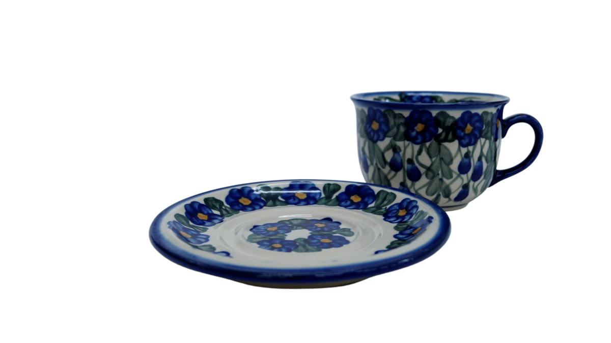 Piękna ceramiczna filiżanka o pojemności 300 ml w zestawie ze spodkiem, zdobione naczynie ceramiczne w piękne wzory kamionki bolesławieckiej. Kawa, kawa z mlekiem, espresso albo mała czarna, latte, caffe latte i wiele innych rodzajów kawy może zostać podana w tej filiżance. A może kawa z dodatkiem cynamonu bądź płatków czekolady? Mniam, sami nabieramy teraz smaku na poranną kawę.
