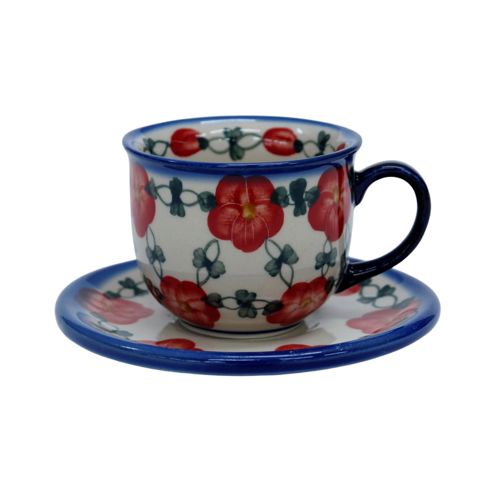 Piękna filiżanka ceramiczna 200 ml ze spodkiem – ręcznie zdobiona ceramika Bolesławiec.