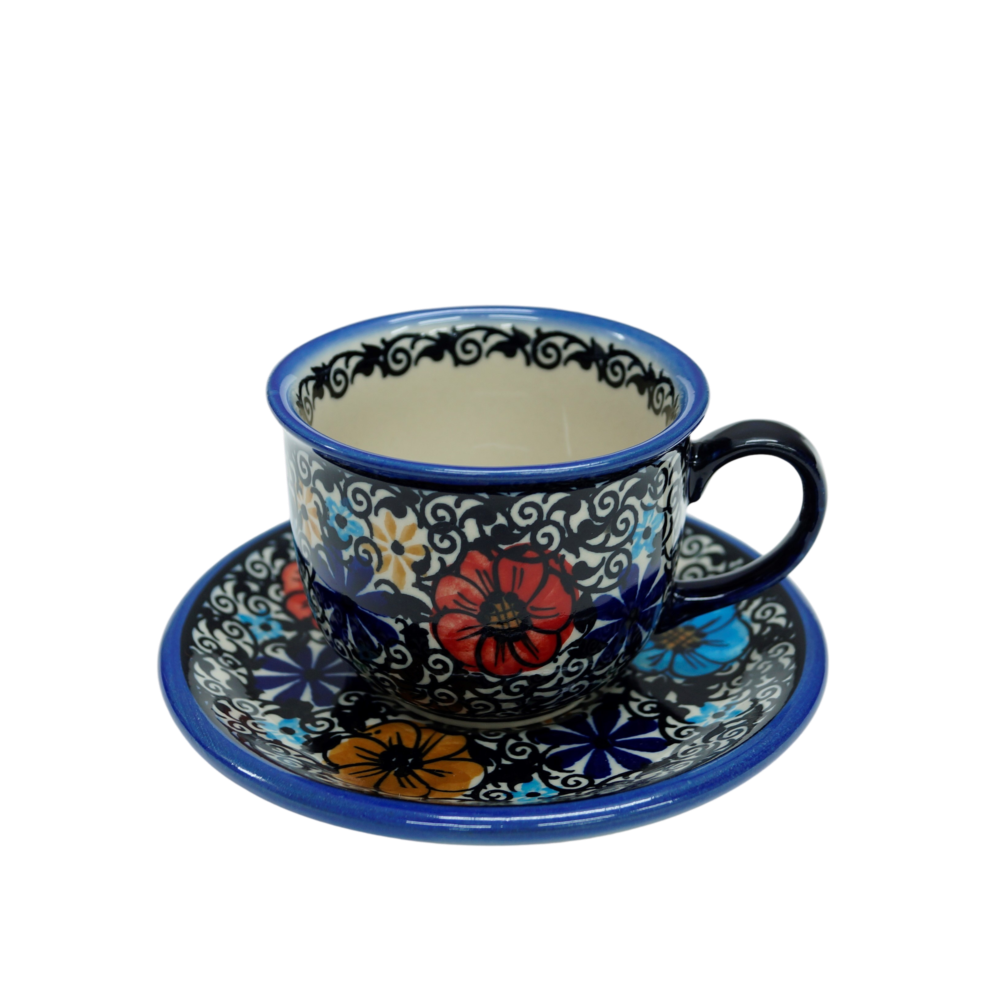 Piękna filiżanka ceramiczna 200 ml ze spodkiem – ręcznie zdobiona ceramika Bolesławiec.
