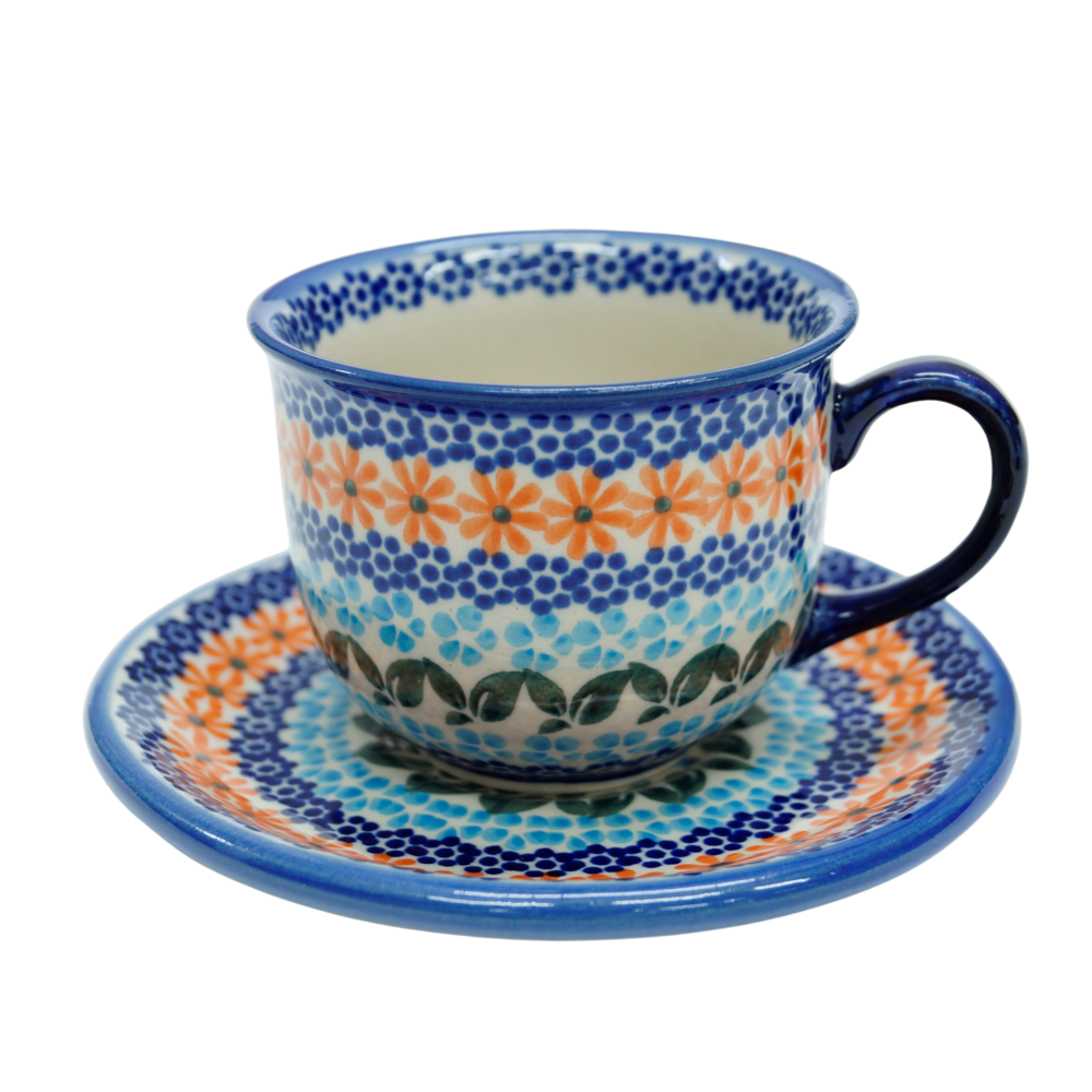 Piękna filiżanka ceramiczna 200 ml ze spodkiem – ręcznie zdobiona ceramika Bolesławiec.