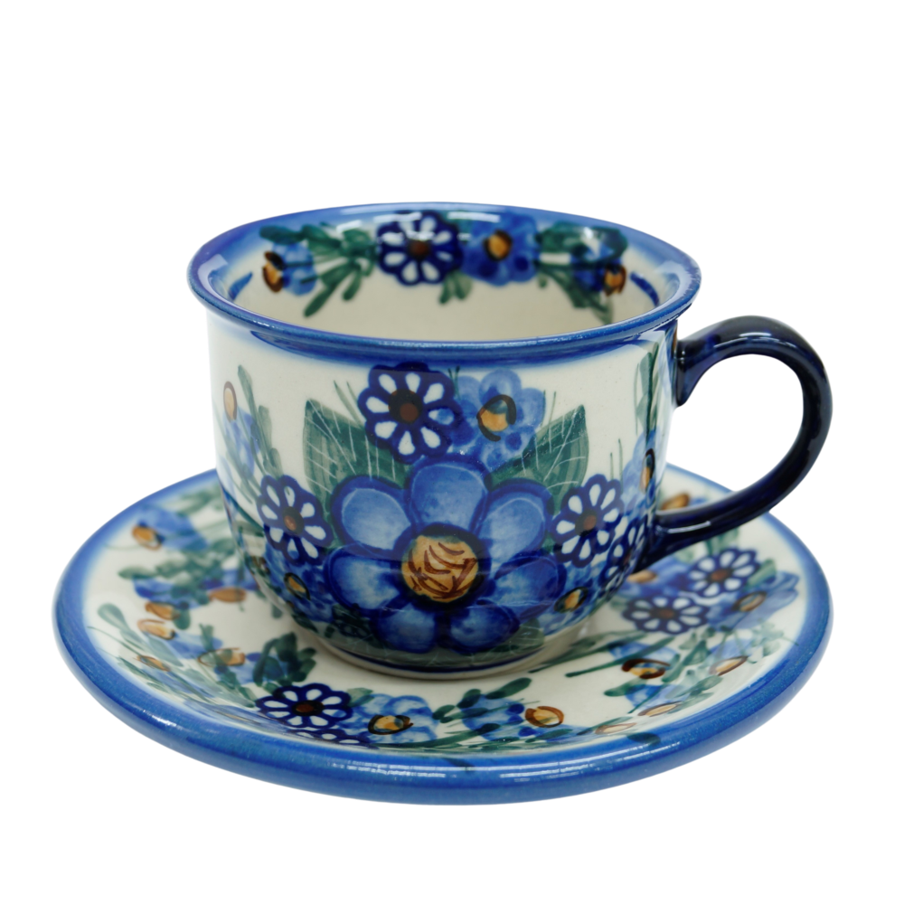 Piękna filiżanka ceramiczna 200 ml ze spodkiem – ręcznie zdobiona ceramika Bolesławiec.