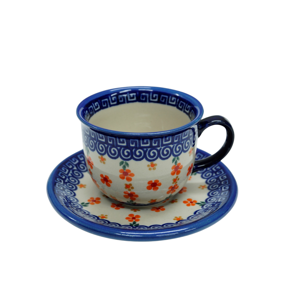 Piękna filiżanka ceramiczna 200 ml ze spodkiem – ręcznie zdobiona ceramika Bolesławiec.