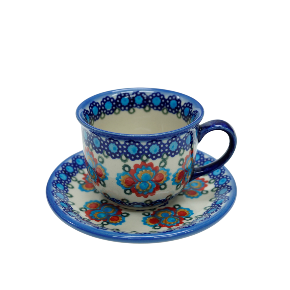 Piękna filiżanka ceramiczna 200 ml ze spodkiem – ręcznie zdobiona ceramika Bolesławiec.