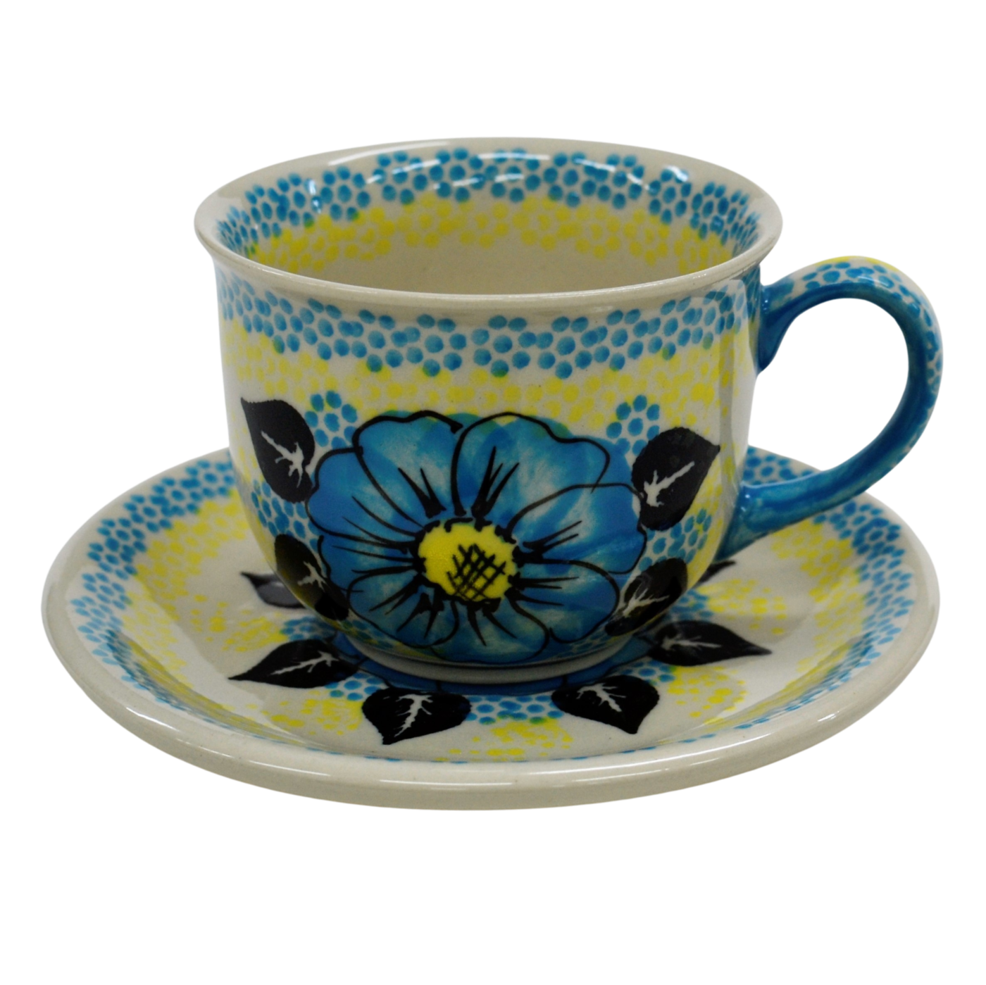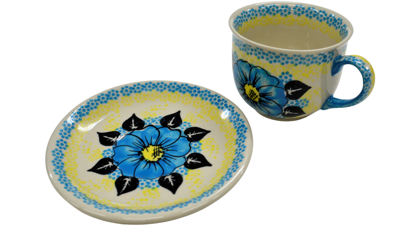 Piękna filiżanka ceramiczna 200 ml ze spodkiem – ręcznie zdobiona ceramika Bolesławiec.