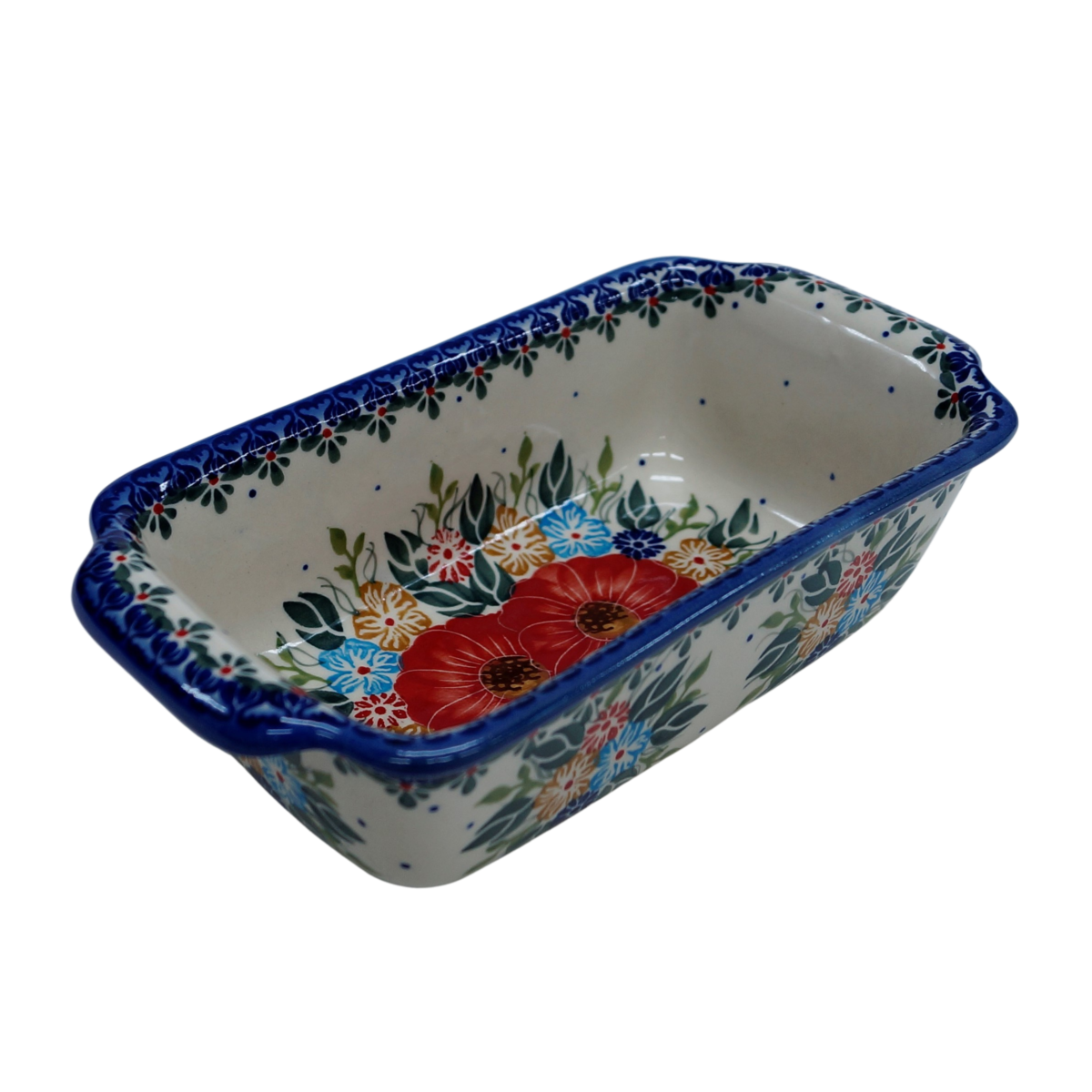 Oryginalny produkt ceramiki bolesławieckiej - ręcznie zdobiona forma ceramiczna z uszami do pieczenia chleba II, idealna do przygotowywania i zapiekania domowych wypieków, chlebów czy ciast oraz wszelkich pasztetów.