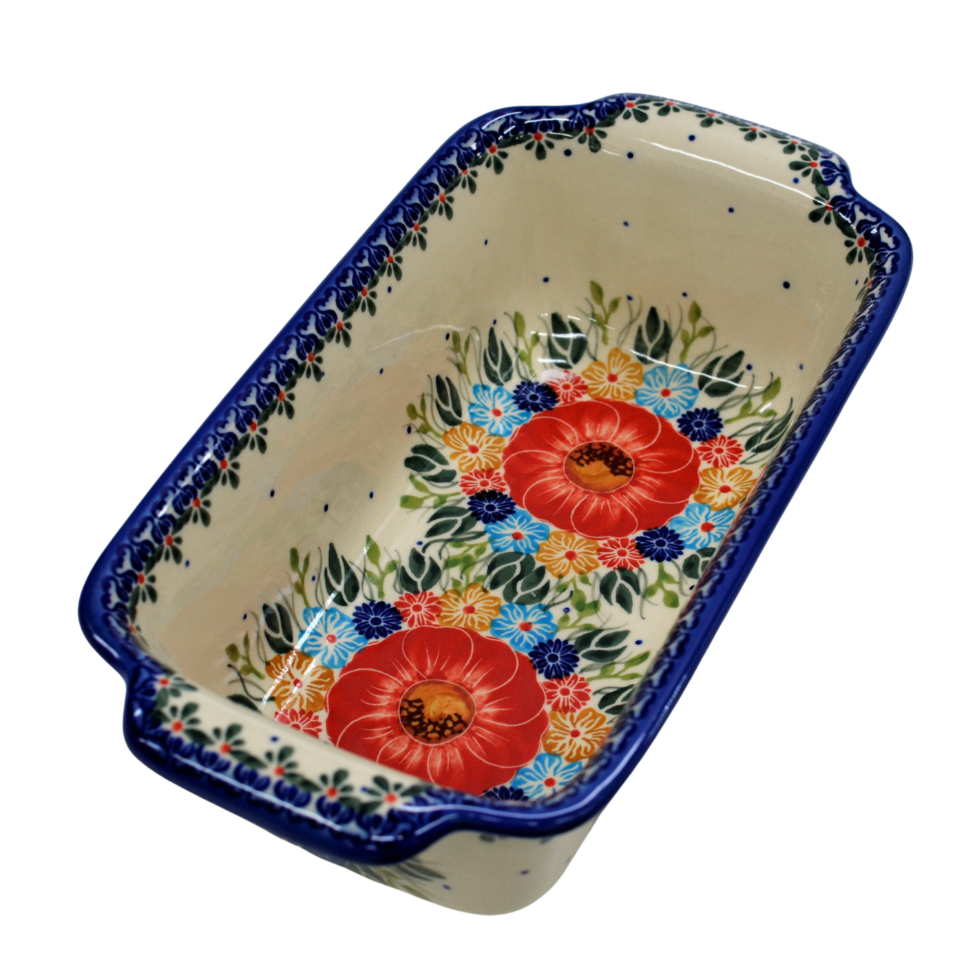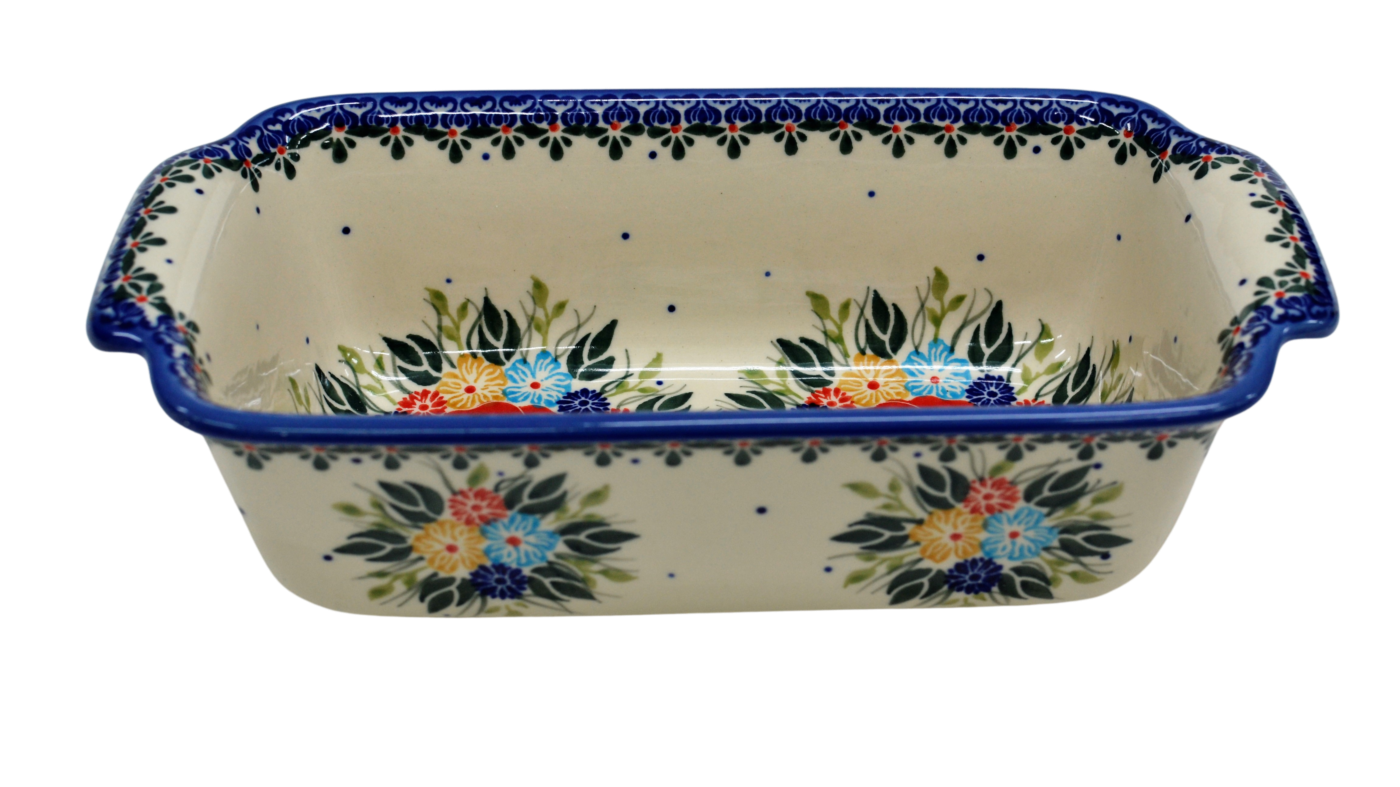 Oryginalny produkt ceramiki bolesławieckiej - ręcznie zdobiona forma ceramiczna z uszami do pieczenia chleba III duża, pojemności 1,3 litra , idealna do przygotowywania i zapiekania domowych wypieków, chlebów czy ciast oraz wszelkich pasztetów.
