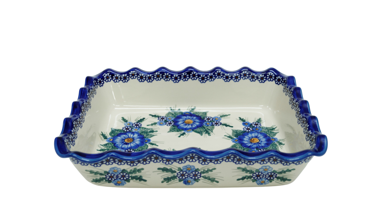 Szkliwione naczynia ceramiczne z Bolesławca to trwałość, jakość i wyjątkowo ślicznie zdobione produkty. Uzupełnij swoją zastawę stołową o piękną formę do zapiekania o prostokątnym kształcie z urokliwą i oryginalną linią brzegową, wywiniętej fali. Rant wywijany nadaje uroku i funkcjonalności, naczynie jest łatwe do przenoszenia - tak zwana krawędź-uchwyt, pomocny w użytkowaniu.