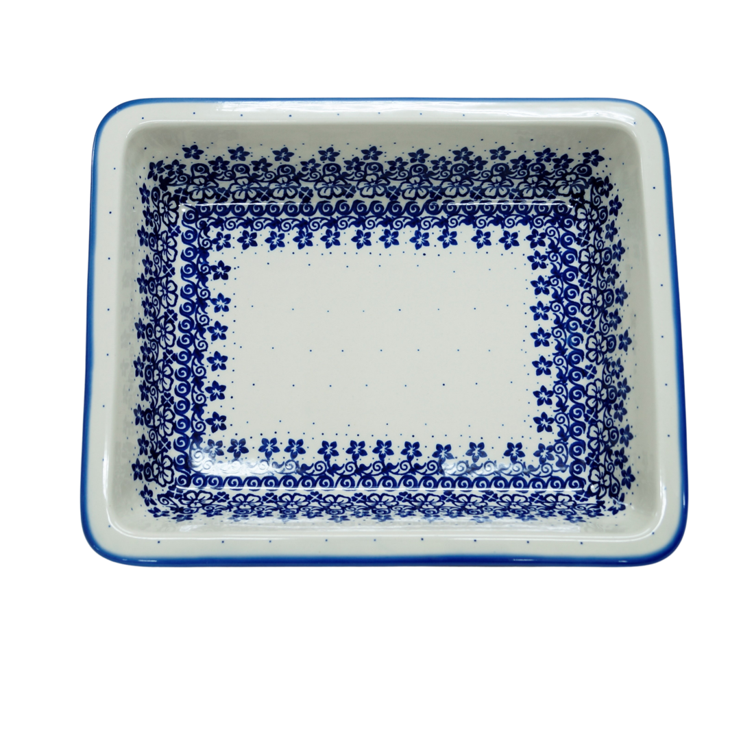 Szkliwione naczynia ceramiczne z Bolesławca to trwałość, jakość i wyjątkowo ślicznie zdobione produkty. Uzupełnij swoją zastawę stołową o piękną formę do zapiekania o prostokątnym kształcie z urokliwą i oryginalną linią brzegową, wywiniętej fali. Rant wywijany nadaje uroku i funkcjonalności, naczynie jest łatwe do przenoszenia - tak zwana krawędź-uchwyt, pomocny w użytkowaniu.
