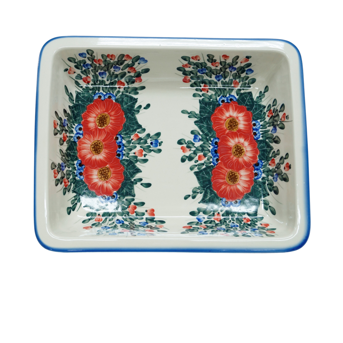 Szkliwione naczynia ceramiczne z Bolesławca to trwałość, jakość i wyjątkowo ślicznie zdobione produkty. Uzupełnij swoją zastawę stołową o piękną formę do zapiekania o prostokątnym kształcie z urokliwą i oryginalną linią brzegową, wywiniętej fali. Rant wywijany nadaje uroku i funkcjonalności, naczynie jest łatwe do przenoszenia - tak zwana krawędź-uchwyt, pomocny w użytkowaniu.
