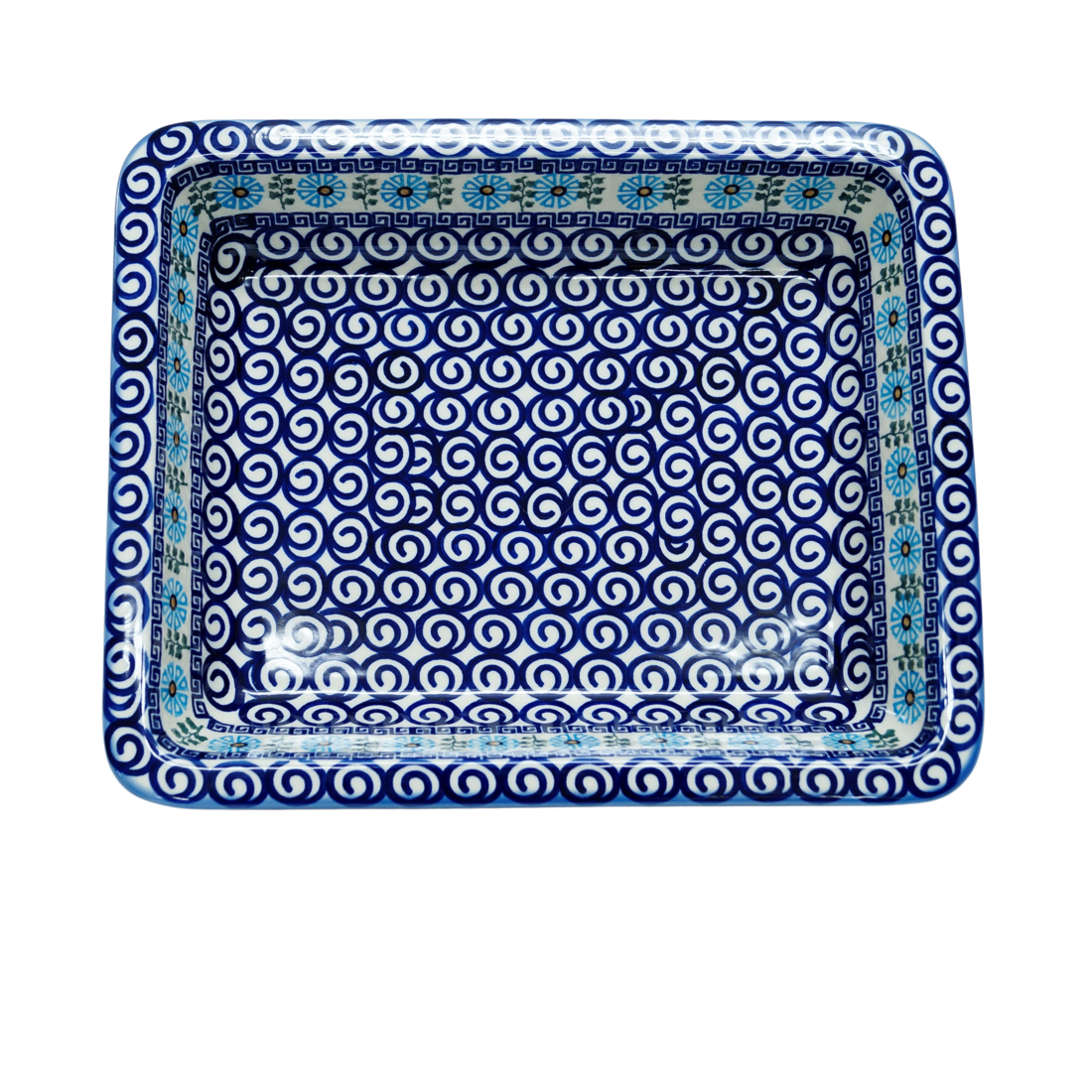 Szkliwione naczynia ceramiczne z Bolesławca to trwałość, jakość i wyjątkowo ślicznie zdobione produkty. Uzupełnij swoją zastawę stołową o piękną formę do zapiekania o prostokątnym kształcie z urokliwą i oryginalną linią brzegową, wywiniętej fali. Rant wywijany nadaje uroku i funkcjonalności, naczynie jest łatwe do przenoszenia - tak zwana krawędź-uchwyt, pomocny w użytkowaniu.