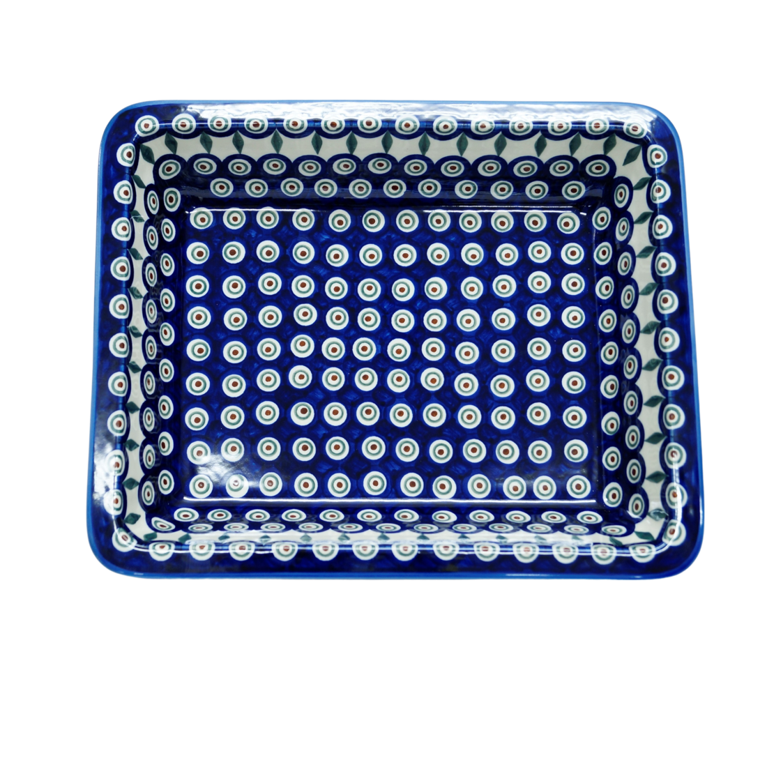 Szkliwione naczynia ceramiczne z Bolesławca to trwałość, jakość i wyjątkowo ślicznie zdobione produkty. Uzupełnij swoją zastawę stołową o piękną formę do zapiekania o prostokątnym kształcie z urokliwą i oryginalną linią brzegową, wywiniętej fali. Rant wywijany nadaje uroku i funkcjonalności, naczynie jest łatwe do przenoszenia - tak zwana krawędź-uchwyt, pomocny w użytkowaniu.