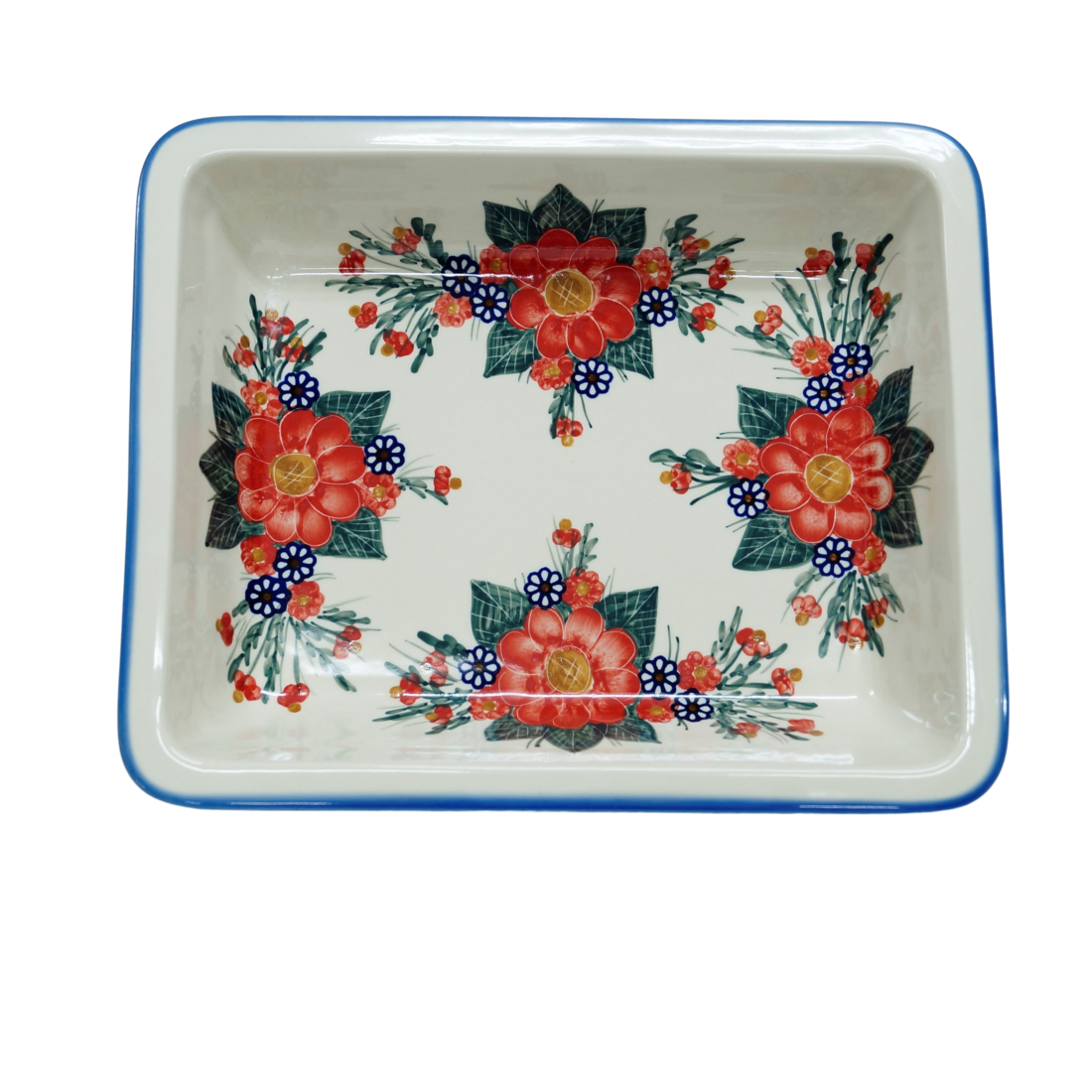Szkliwione naczynia ceramiczne z Bolesławca to trwałość, jakość i wyjątkowo ślicznie zdobione produkty. Uzupełnij swoją zastawę stołową o piękną formę do zapiekania o prostokątnym kształcie z urokliwą i oryginalną linią brzegową, wywiniętej fali. Rant wywijany nadaje uroku i funkcjonalności, naczynie jest łatwe do przenoszenia - tak zwana krawędź-uchwyt, pomocny w użytkowaniu.