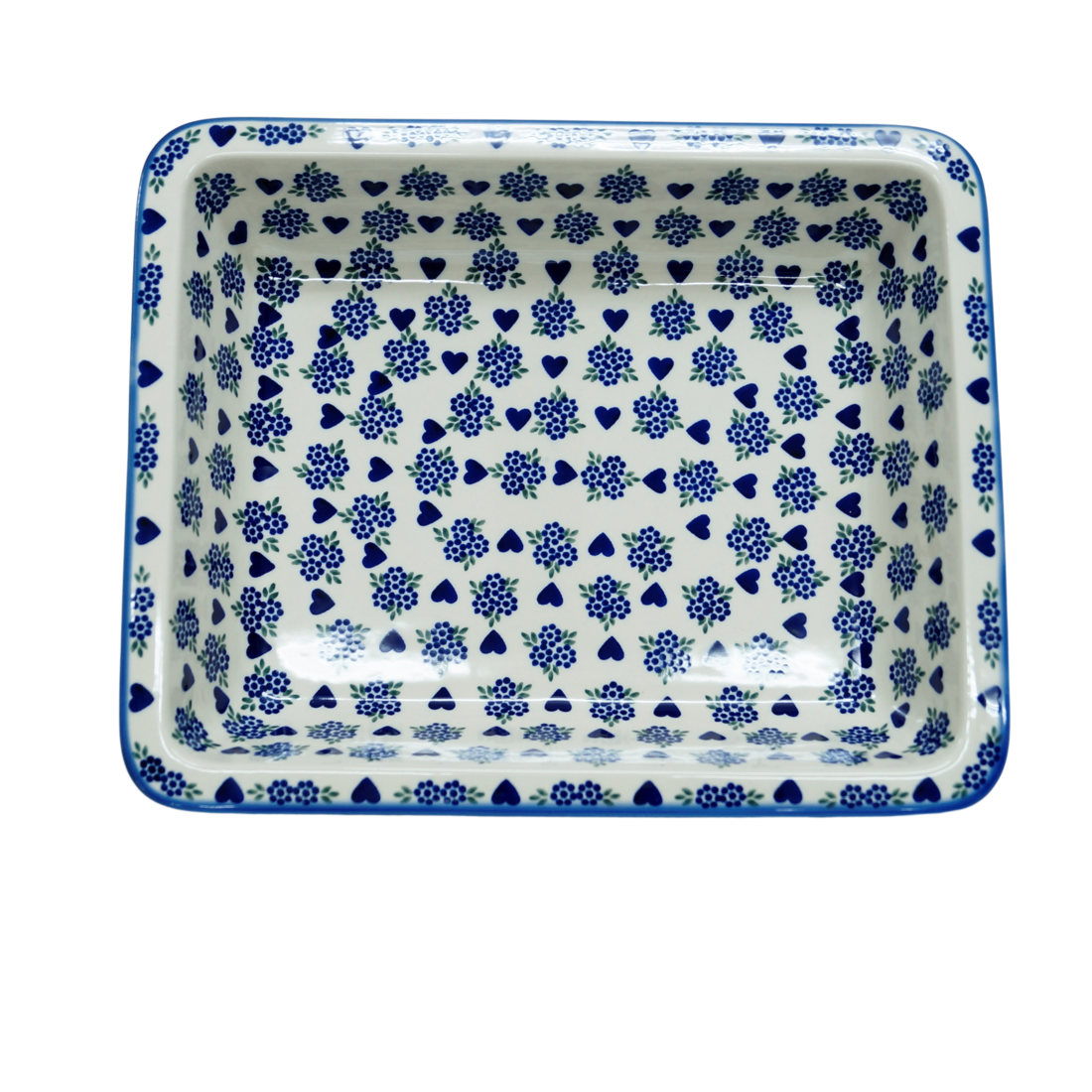 Szkliwione naczynia ceramiczne z Bolesławca to trwałość, jakość i wyjątkowo ślicznie zdobione produkty. Uzupełnij swoją zastawę stołową o piękną formę do zapiekania o prostokątnym kształcie z urokliwą i oryginalną linią brzegową, wywiniętej fali. Rant wywijany nadaje uroku i funkcjonalności, naczynie jest łatwe do przenoszenia - tak zwana krawędź-uchwyt, pomocny w użytkowaniu.