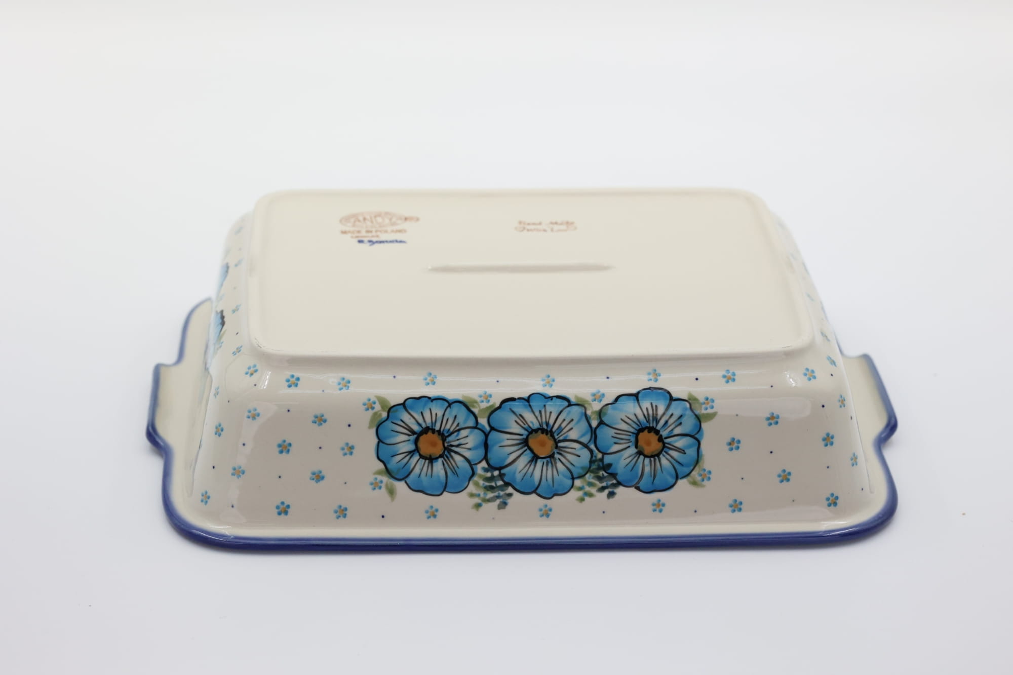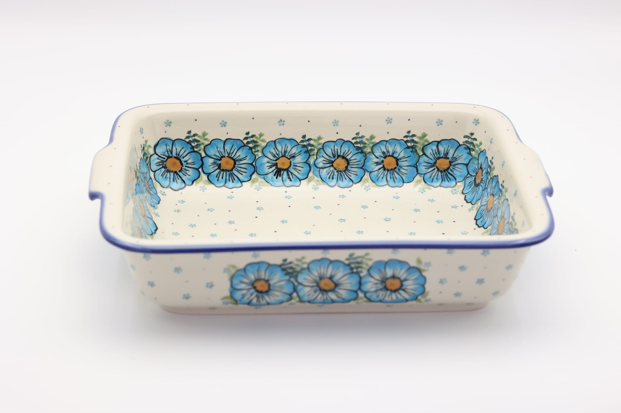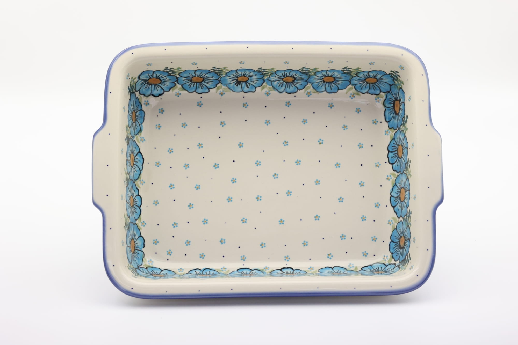 Szkliwione naczynia ceramiczne z Bolesławca to trwałość, jakość i wyjątkowo ślicznie zdobione produkty. Uzupełnij swoją zastawę stołową o piękną formę do zapiekania o prostokątnym kształcie z urokliwą i oryginalną linią brzegową. Rant wysunięty na zewnątrz nadaje uroku i funkcjonalności, naczynie jest łatwe do przenoszenia - tak zwana krawędź-uchwyt, pomocny w użytkowaniu, łatwiej przeniesiesz gorące naczynie prosto z piekarnika.