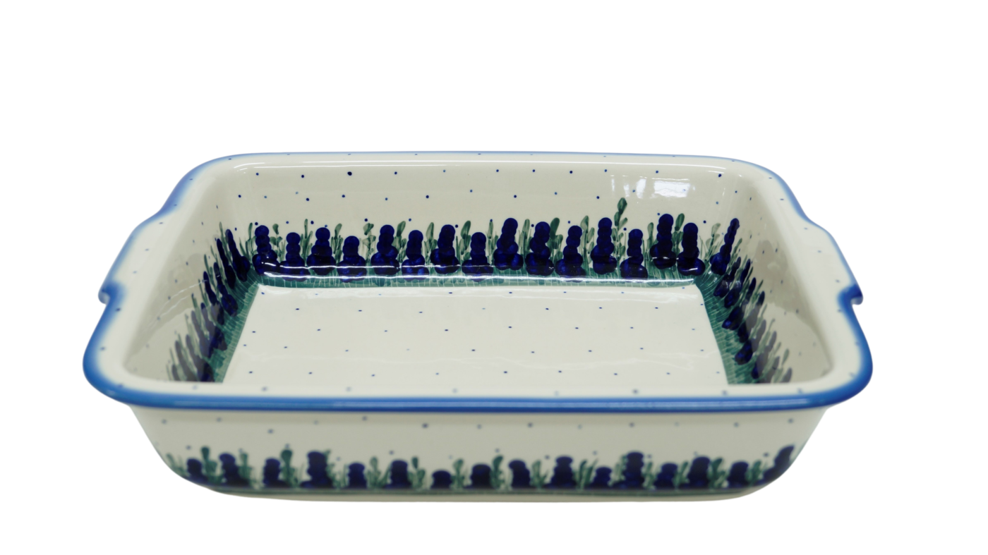 Szkliwione naczynia ceramiczne z Bolesławca to trwałość, jakość i wyjątkowo ślicznie zdobione produkty. Uzupełnij swoją zastawę stołową o piękną formę do zapiekania o prostokątnym kształcie z urokliwą i oryginalną linią brzegową. Rant wysunięty na zewnątrz nadaje uroku i funkcjonalności, naczynie jest łatwe do przenoszenia - tak zwana krawędź-uchwyt, pomocny w użytkowaniu, łatwiej przeniesiesz gorące naczynie prosto z piekarnika.