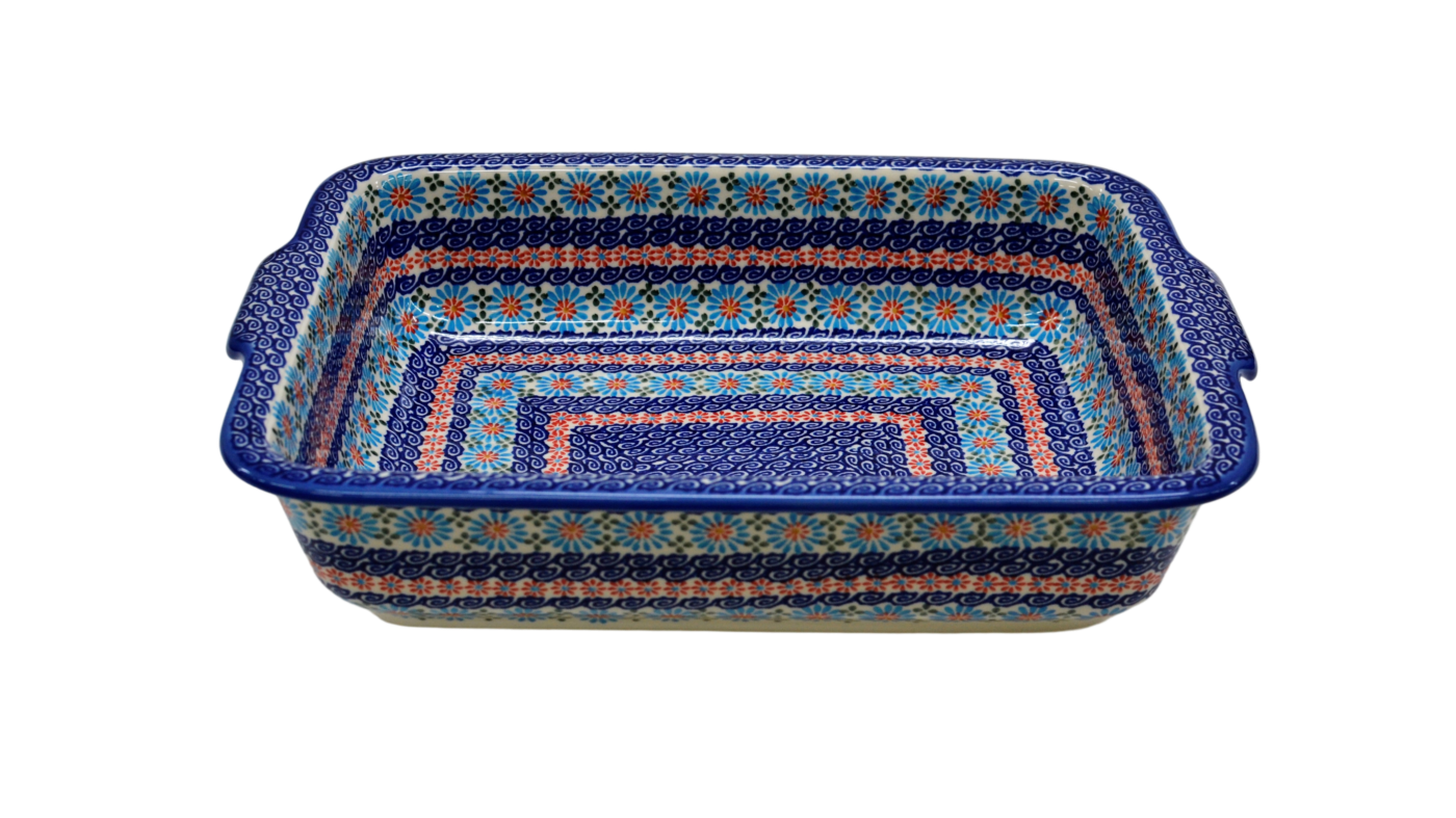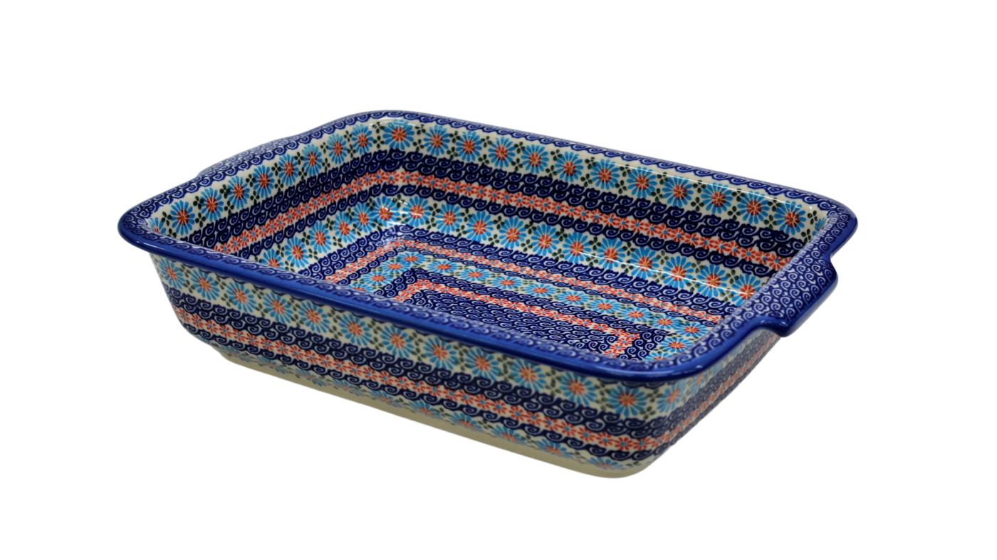 Szkliwione naczynia ceramiczne z Bolesławca to trwałość, jakość i wyjątkowo ślicznie zdobione produkty. Uzupełnij swoją zastawę stołową o piękną formę do zapiekania o prostokątnym kształcie z urokliwą i oryginalną linią brzegową. Rant wysunięty na zewnątrz nadaje uroku i funkcjonalności, naczynie jest łatwe do przenoszenia - tak zwana krawędź-uchwyt, pomocny w użytkowaniu, łatwiej przeniesiesz gorące naczynie prosto z piekarnika.