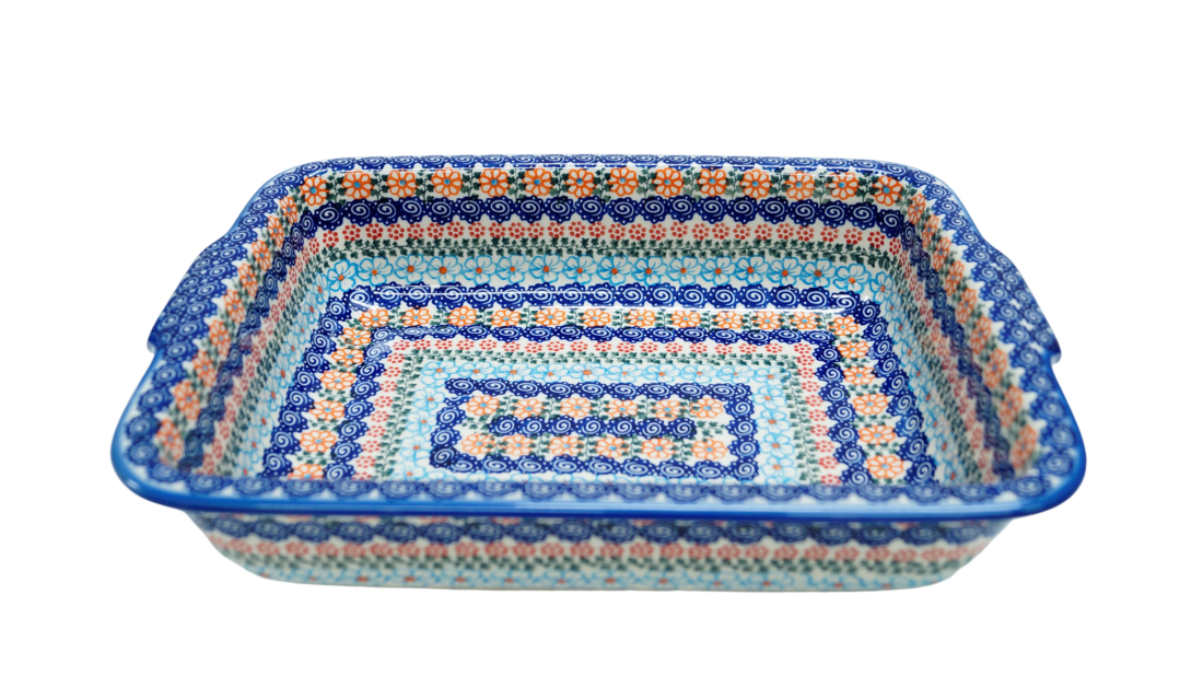 Szkliwione naczynia ceramiczne z Bolesławca to trwałość, jakość i wyjątkowo ślicznie zdobione produkty. Uzupełnij swoją zastawę stołową o piękną formę do zapiekania o prostokątnym kształcie z urokliwą i oryginalną linią brzegową. Rant wysunięty na zewnątrz nadaje uroku i funkcjonalności, naczynie jest łatwe do przenoszenia - tak zwana krawędź-uchwyt, pomocny w użytkowaniu, łatwiej przeniesiesz gorące naczynie prosto z piekarnika.