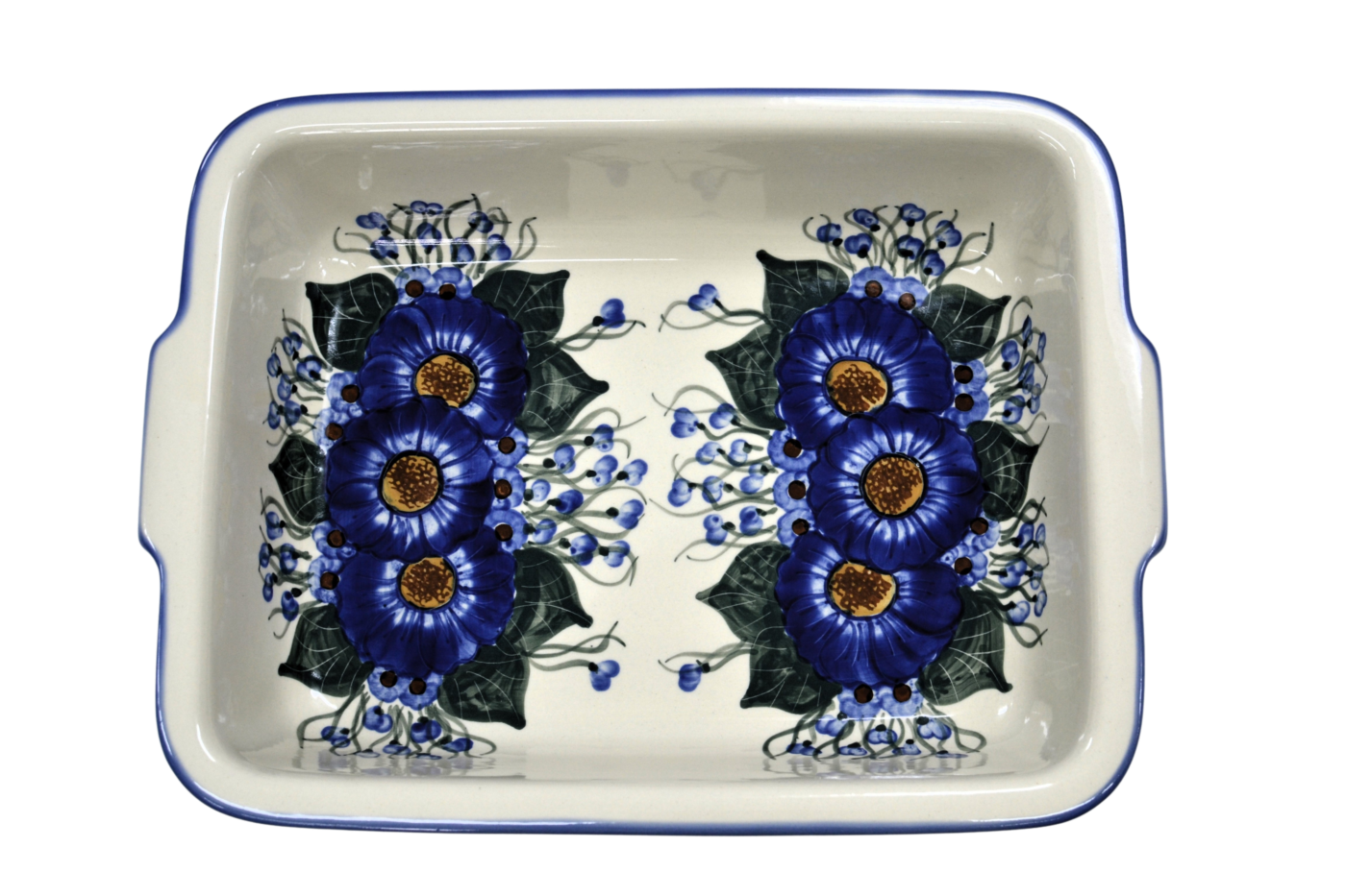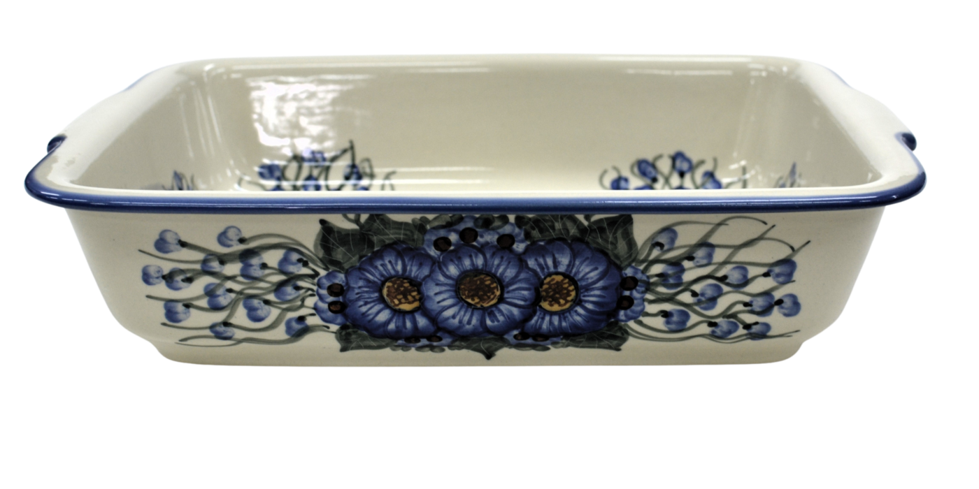 Szkliwione naczynia ceramiczne z Bolesławca to trwałość, jakość i wyjątkowo ślicznie zdobione produkty. Uzupełnij swoją zastawę stołową o piękną formę do zapiekania o prostokątnym kształcie z urokliwą i oryginalną linią brzegową. Rant wysunięty na zewnątrz nadaje uroku i funkcjonalności, naczynie jest łatwe do przenoszenia - tak zwana krawędź-uchwyt, pomocny w użytkowaniu, łatwiej przeniesiesz gorące naczynie prosto z piekarnika.