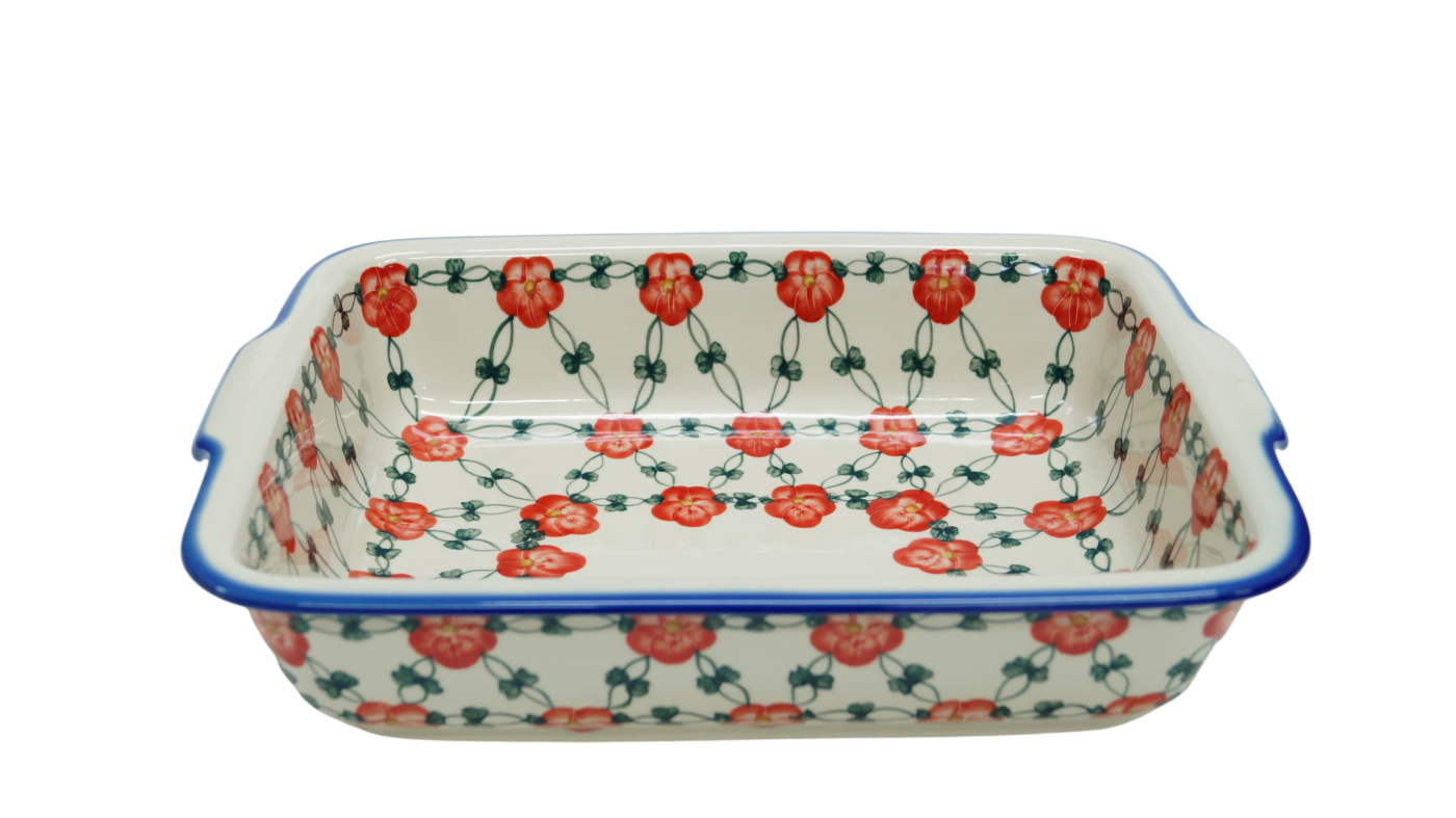 Szkliwione naczynia ceramiczne z Bolesławca to trwałość, jakość i wyjątkowo ślicznie zdobione produkty. Uzupełnij swoją zastawę stołową o piękną formę do zapiekania o prostokątnym kształcie z urokliwą i oryginalną linią brzegową. Rant wysunięty na zewnątrz nadaje uroku i funkcjonalności, naczynie jest łatwe do przenoszenia - tak zwana krawędź-uchwyt, pomocny w użytkowaniu, łatwiej przeniesiesz gorące naczynie prosto z piekarnika.