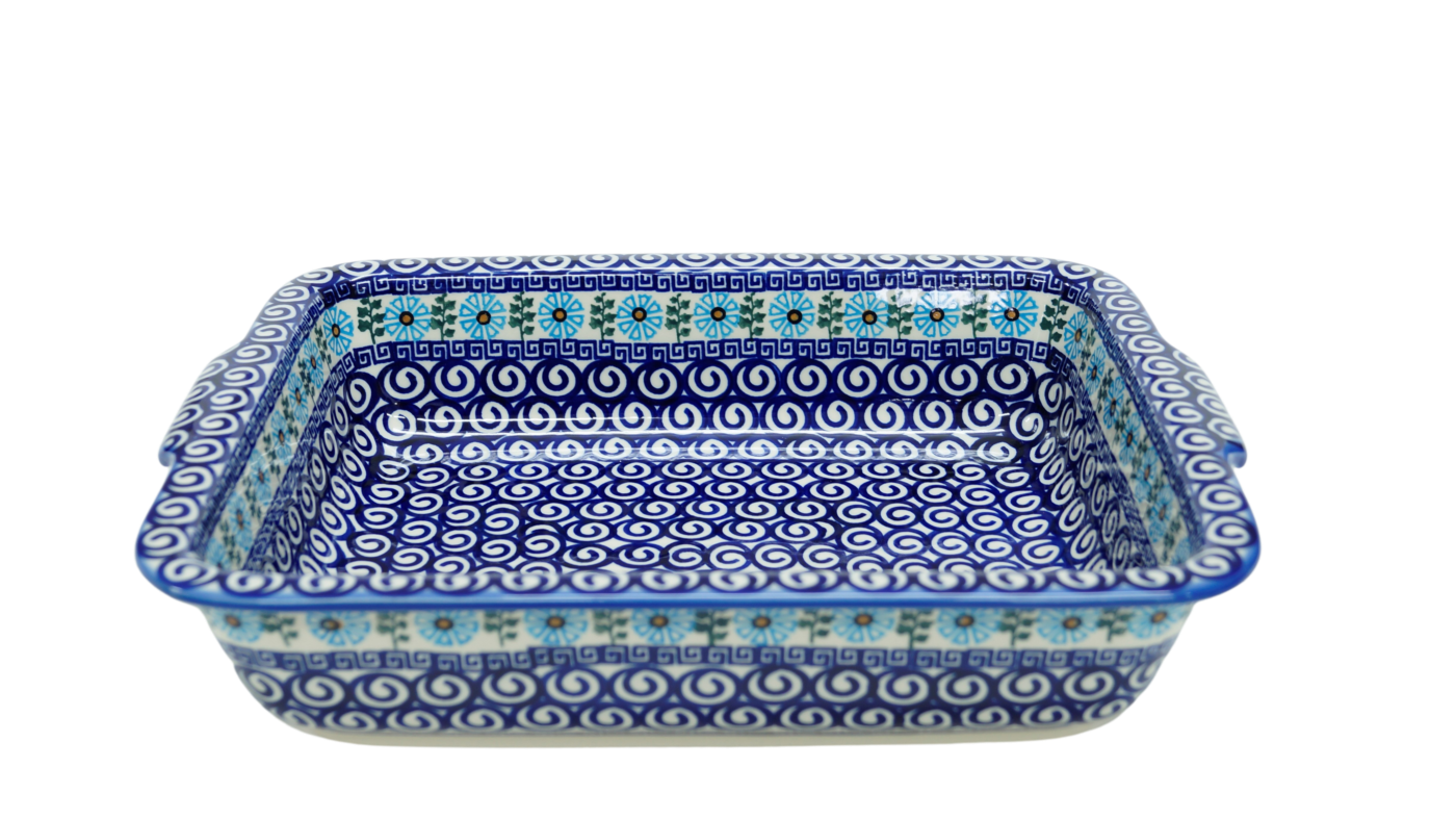 Szkliwione naczynia ceramiczne z Bolesławca to trwałość, jakość i wyjątkowo ślicznie zdobione produkty. Uzupełnij swoją zastawę stołową o piękną formę do zapiekania o prostokątnym kształcie z urokliwą i oryginalną linią brzegową. Rant wysunięty na zewnątrz nadaje uroku i funkcjonalności, naczynie jest łatwe do przenoszenia - tak zwana krawędź-uchwyt, pomocny w użytkowaniu, łatwiej przeniesiesz gorące naczynie prosto z piekarnika.