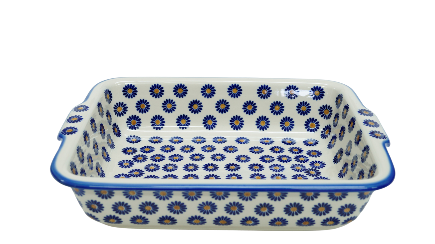 Szkliwione naczynia ceramiczne z Bolesławca to trwałość, jakość i wyjątkowo ślicznie zdobione produkty. Uzupełnij swoją zastawę stołową o piękną formę do zapiekania o prostokątnym kształcie z urokliwą i oryginalną linią brzegową. Rant wysunięty na zewnątrz nadaje uroku i funkcjonalności, naczynie jest łatwe do przenoszenia - tak zwana krawędź-uchwyt, pomocny w użytkowaniu, łatwiej przeniesiesz gorące naczynie prosto z piekarnika.