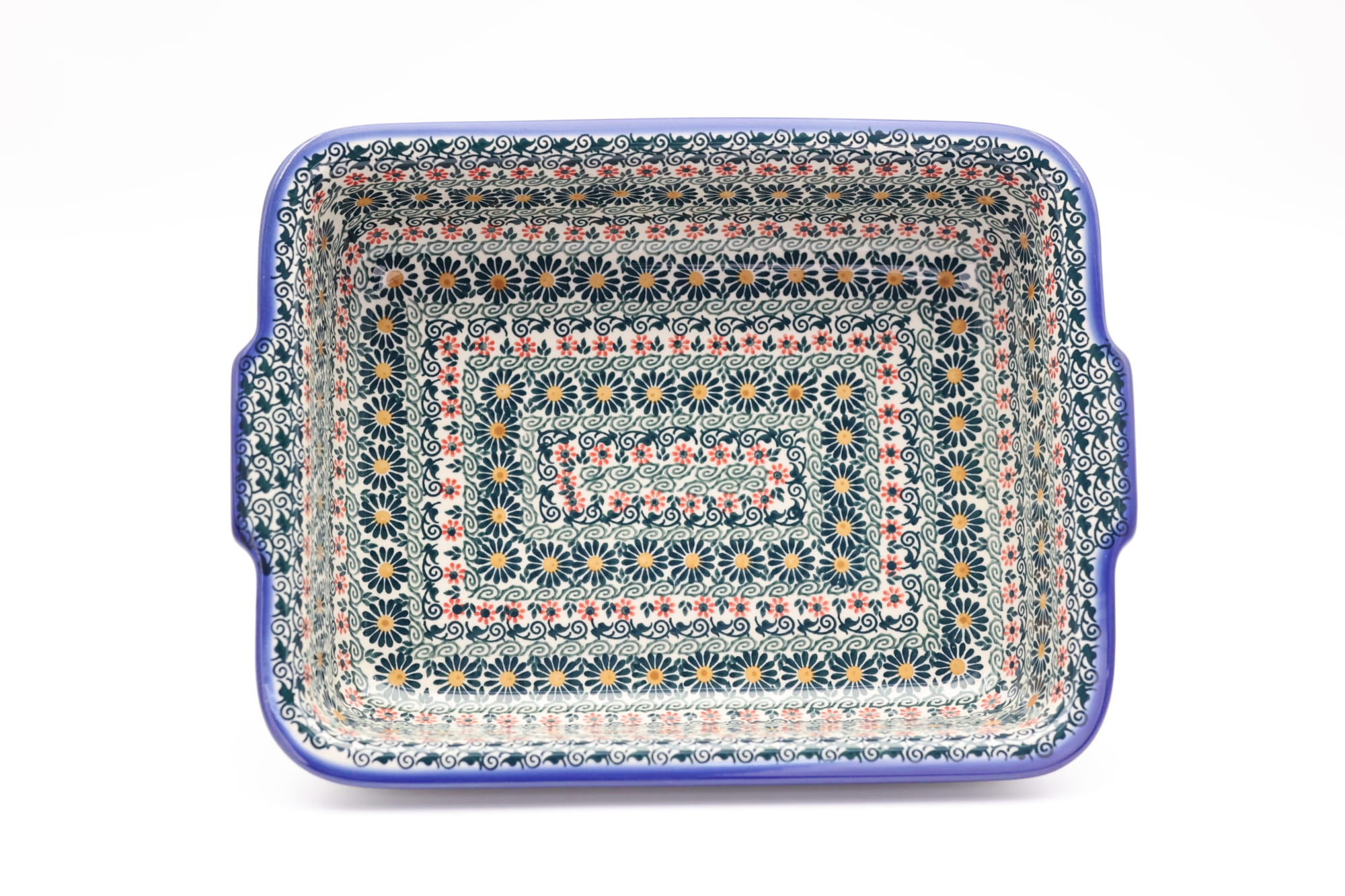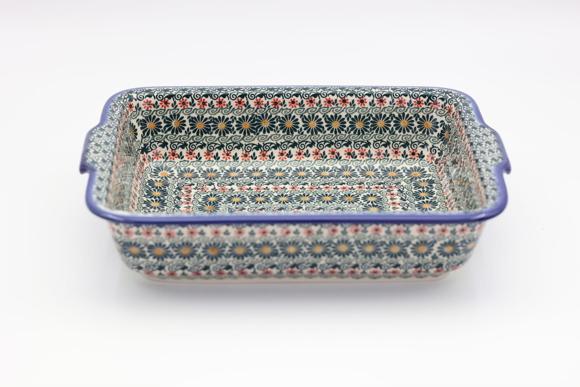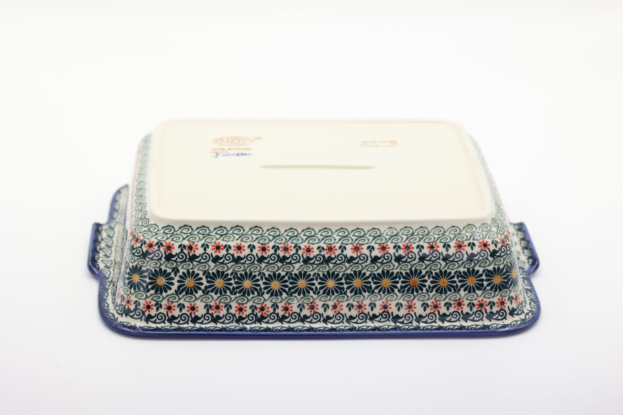 Szkliwione naczynia ceramiczne z Bolesławca to trwałość, jakość i wyjątkowo ślicznie zdobione produkty. Uzupełnij swoją zastawę stołową o piękną formę do zapiekania o prostokątnym kształcie z urokliwą i oryginalną linią brzegową. Rant wysunięty na zewnątrz nadaje uroku i funkcjonalności, naczynie jest łatwe do przenoszenia - tak zwana krawędź-uchwyt, pomocny w użytkowaniu, łatwiej przeniesiesz gorące naczynie prosto z piekarnika.