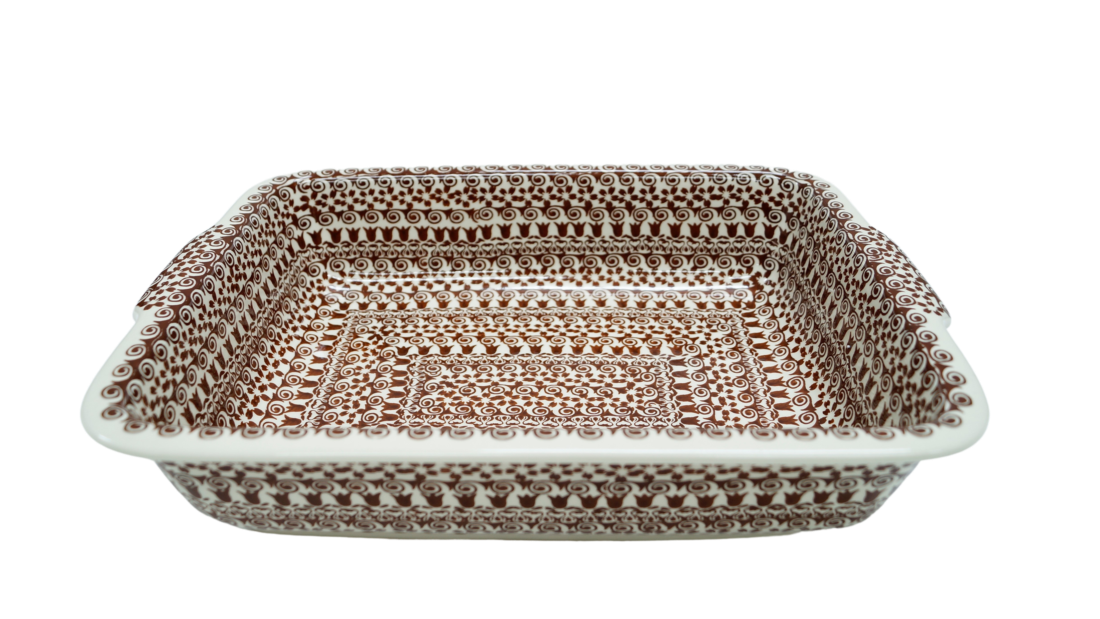 Szkliwione naczynia ceramiczne z Bolesławca to trwałość, jakość i wyjątkowo ślicznie zdobione produkty. Uzupełnij swoją zastawę stołową o piękną formę do zapiekania o prostokątnym kształcie z urokliwą i oryginalną linią brzegową. Rant wysunięty na zewnątrz nadaje uroku i funkcjonalności, naczynie jest łatwe do przenoszenia - tak zwana krawędź-uchwyt, pomocny w użytkowaniu, łatwiej przeniesiesz gorące naczynie prosto z piekarnika.