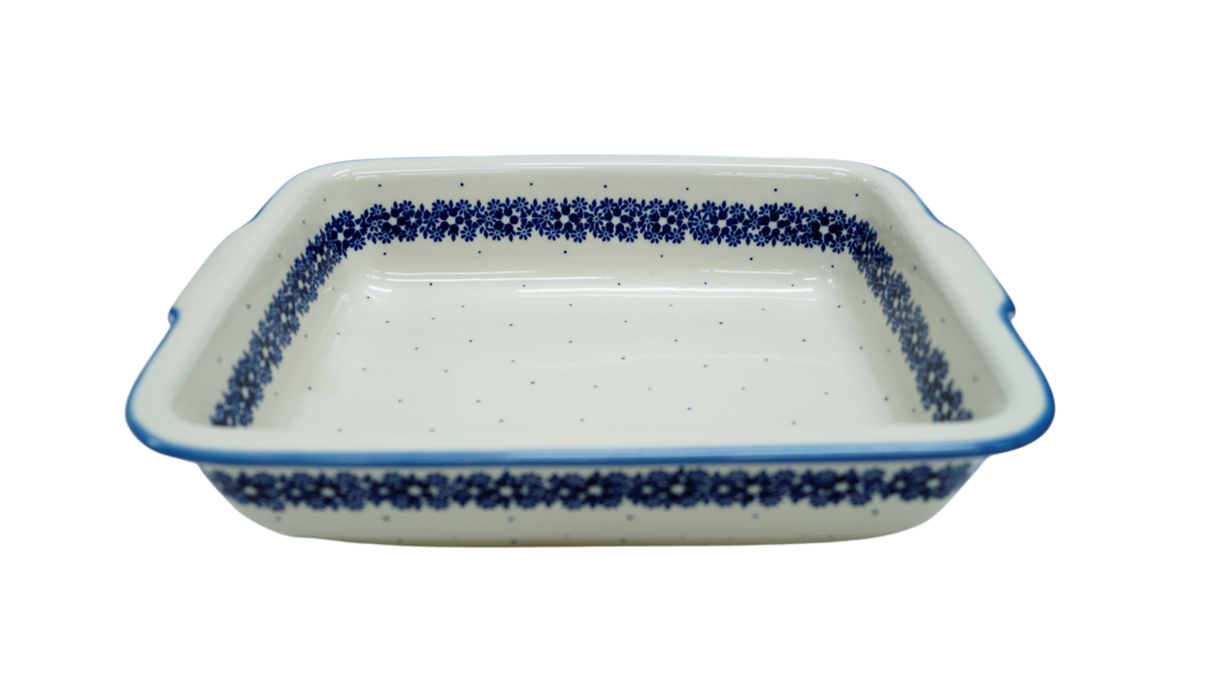 Szkliwione naczynia ceramiczne z Bolesławca to trwałość, jakość i wyjątkowo ślicznie zdobione produkty. Uzupełnij swoją zastawę stołową o piękną formę do zapiekania o prostokątnym kształcie z urokliwą i oryginalną linią brzegową. Rant wysunięty na zewnątrz nadaje uroku i funkcjonalności, naczynie jest łatwe do przenoszenia - tak zwana krawędź-uchwyt, pomocny w użytkowaniu, łatwiej przeniesiesz gorące naczynie prosto z piekarnika.