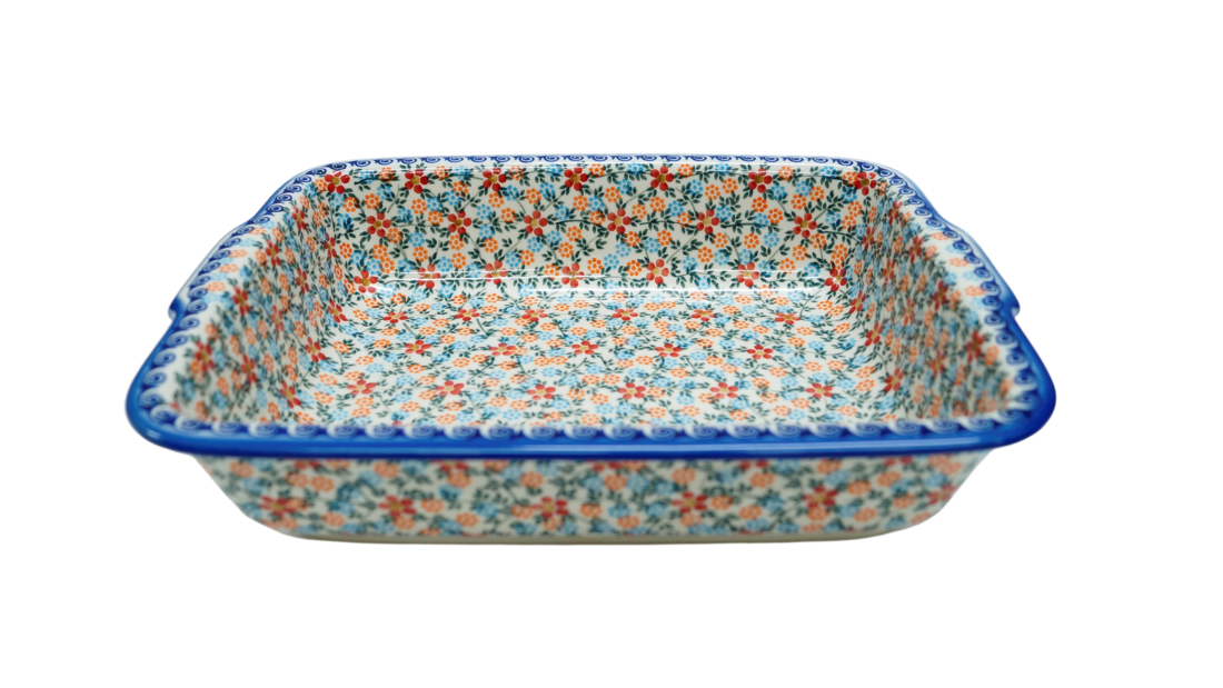 Szkliwione naczynia ceramiczne z Bolesławca to trwałość, jakość i wyjątkowo ślicznie zdobione produkty. Uzupełnij swoją zastawę stołową o piękną formę do zapiekania o prostokątnym kształcie z urokliwą i oryginalną linią brzegową. Rant wysunięty na zewnątrz nadaje uroku i funkcjonalności, naczynie jest łatwe do przenoszenia - tak zwana krawędź-uchwyt, pomocny w użytkowaniu, łatwiej przeniesiesz gorące naczynie prosto z piekarnika.