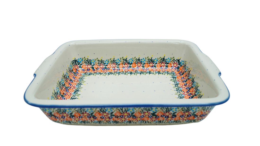 Szkliwione naczynia ceramiczne z Bolesławca to trwałość, jakość i wyjątkowo ślicznie zdobione produkty. Uzupełnij swoją zastawę stołową o piękną formę do zapiekania o prostokątnym kształcie z urokliwą i oryginalną linią brzegową. Rant wysunięty na zewnątrz nadaje uroku i funkcjonalności, naczynie jest łatwe do przenoszenia - tak zwana krawędź-uchwyt, pomocny w użytkowaniu, łatwiej przeniesiesz gorące naczynie prosto z piekarnika.
