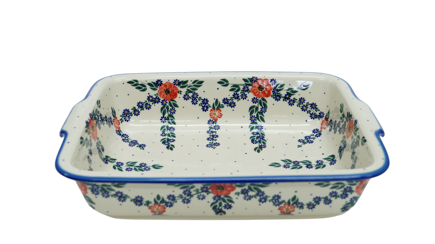 Szkliwione naczynia ceramiczne z Bolesławca to trwałość, jakość i wyjątkowo ślicznie zdobione produkty. Uzupełnij swoją zastawę stołową o piękną formę do zapiekania o prostokątnym kształcie z urokliwą i oryginalną linią brzegową. Rant wysunięty na zewnątrz nadaje uroku i funkcjonalności, naczynie jest łatwe do przenoszenia - tak zwana krawędź-uchwyt, pomocny w użytkowaniu, łatwiej przeniesiesz gorące naczynie prosto z piekarnika.