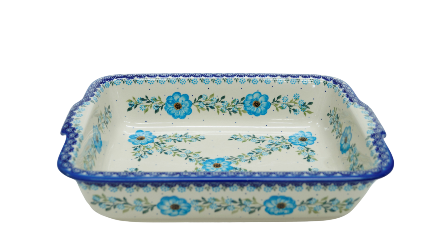 Szkliwione naczynia ceramiczne z Bolesławca to trwałość, jakość i wyjątkowo ślicznie zdobione produkty. Uzupełnij swoją zastawę stołową o piękną formę do zapiekania o prostokątnym kształcie z urokliwą i oryginalną linią brzegową. Rant wysunięty na zewnątrz nadaje uroku i funkcjonalności, naczynie jest łatwe do przenoszenia - tak zwana krawędź-uchwyt, pomocny w użytkowaniu, łatwiej przeniesiesz gorące naczynie prosto z piekarnika.