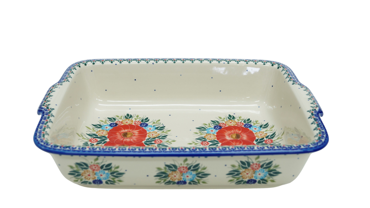 Szkliwione naczynia ceramiczne z Bolesławca to trwałość, jakość i wyjątkowo ślicznie zdobione produkty. Uzupełnij swoją zastawę stołową o piękną formę do zapiekania o prostokątnym kształcie z urokliwą i oryginalną linią brzegową. Rant wysunięty na zewnątrz nadaje uroku i funkcjonalności, naczynie jest łatwe do przenoszenia - tak zwana krawędź-uchwyt, pomocny w użytkowaniu, łatwiej przeniesiesz gorące naczynie prosto z piekarnika.